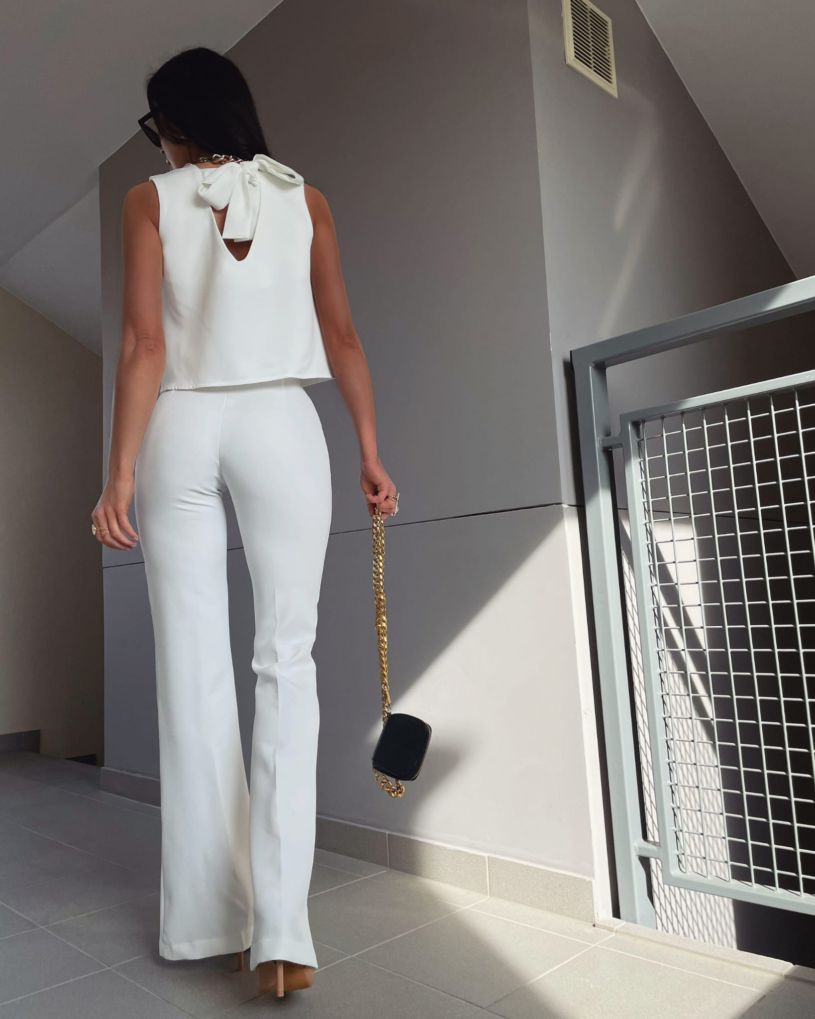 Bluzka charakteryzuje się gładkim wykończeniem tkaniny oraz zdobieniem na plecach w postaci uroczego wiązania.