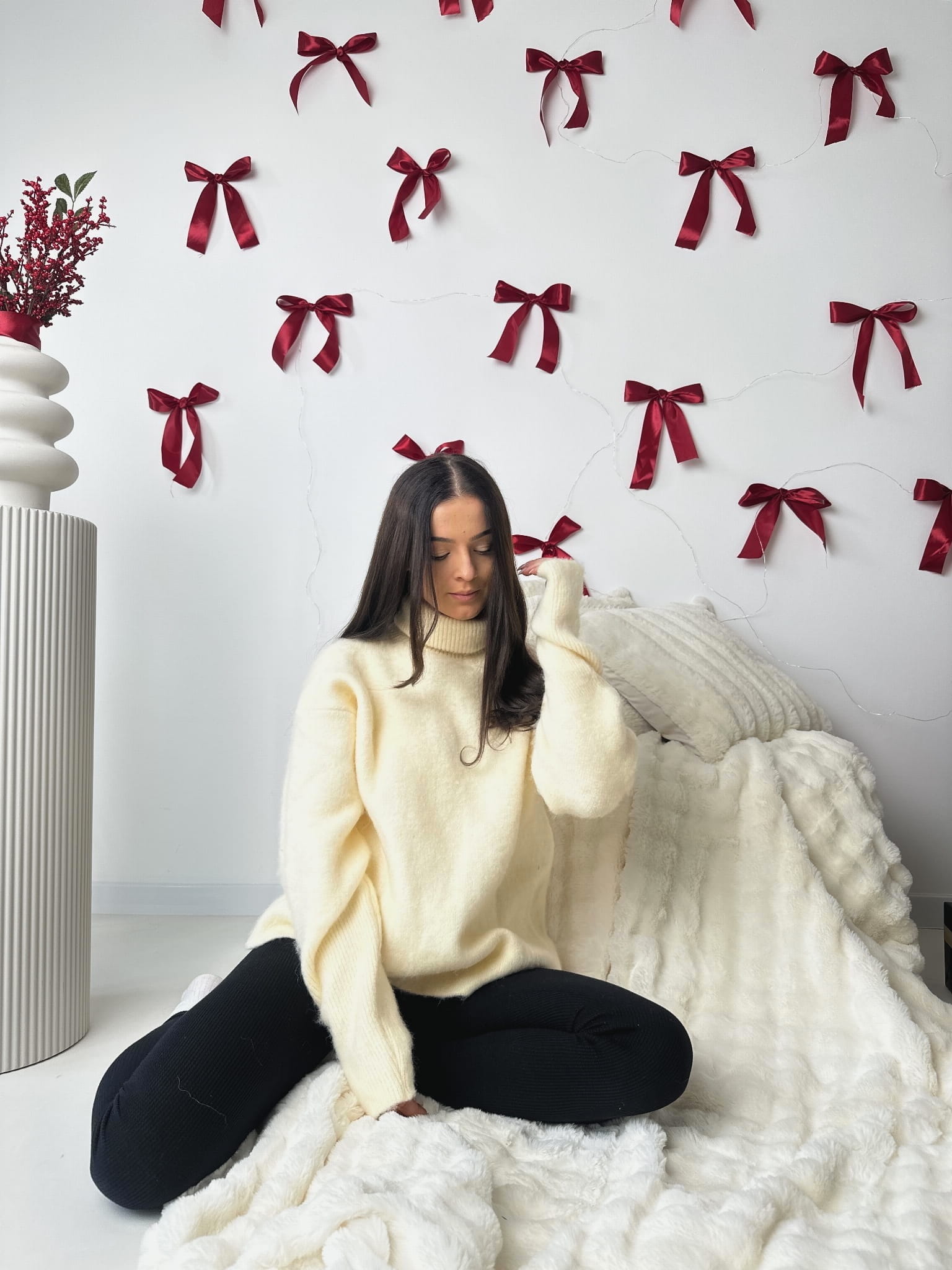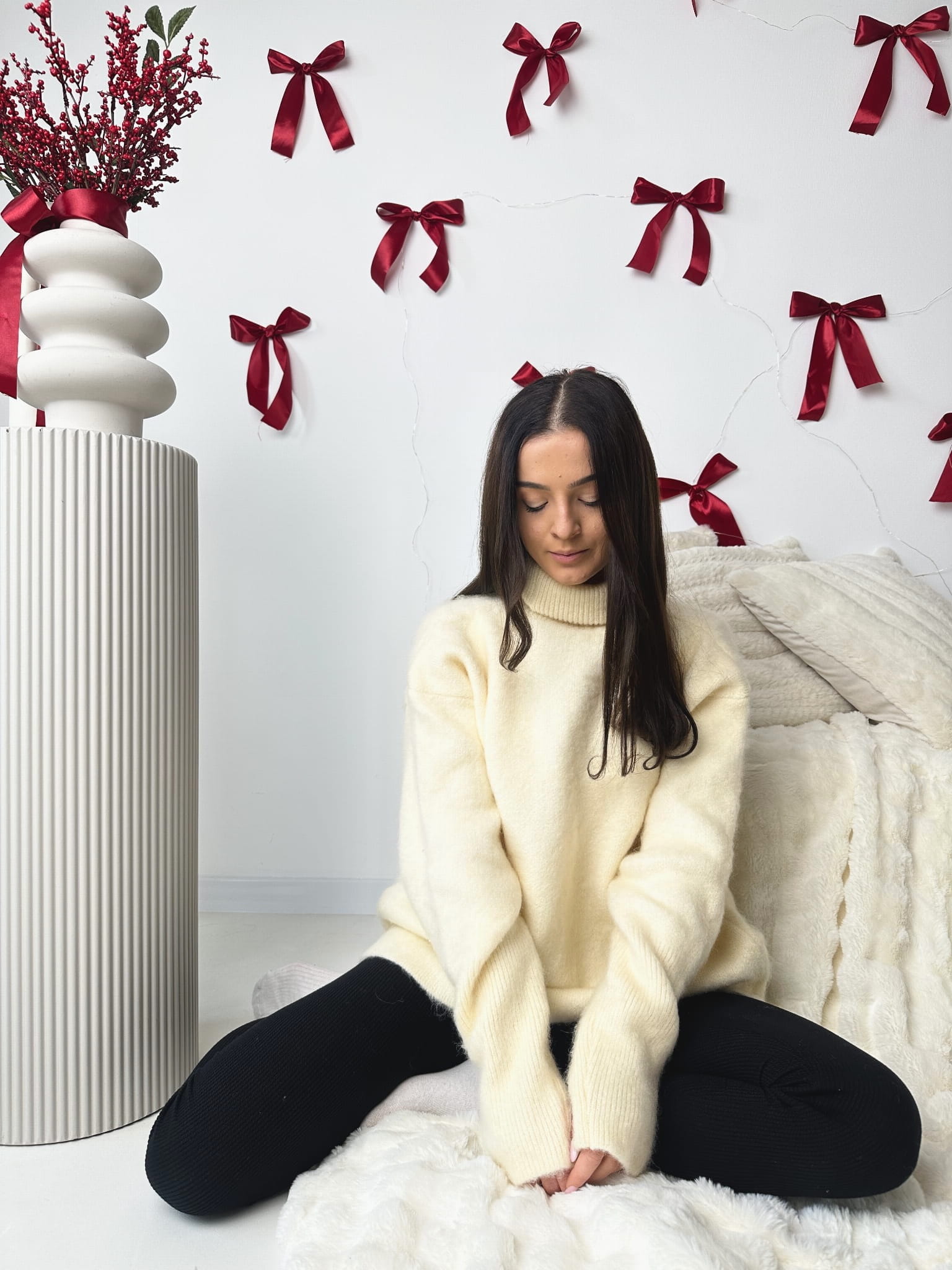 WEŁNIANY SWETER - wełniany sweter z wysokim golfem - który bez problemu można wywinąć aby go skrócić. Posiada wycięcie na kciuk przy rękawach. Idealny na zimowe wyjazdy podczas, których będziemy sobie cenić ciepło oraz modowy styl. Świetny do casualowych i eleganckich stylizacji. Dostępny w dwóch wariantach kolorystycznych - róż oraz ecru.