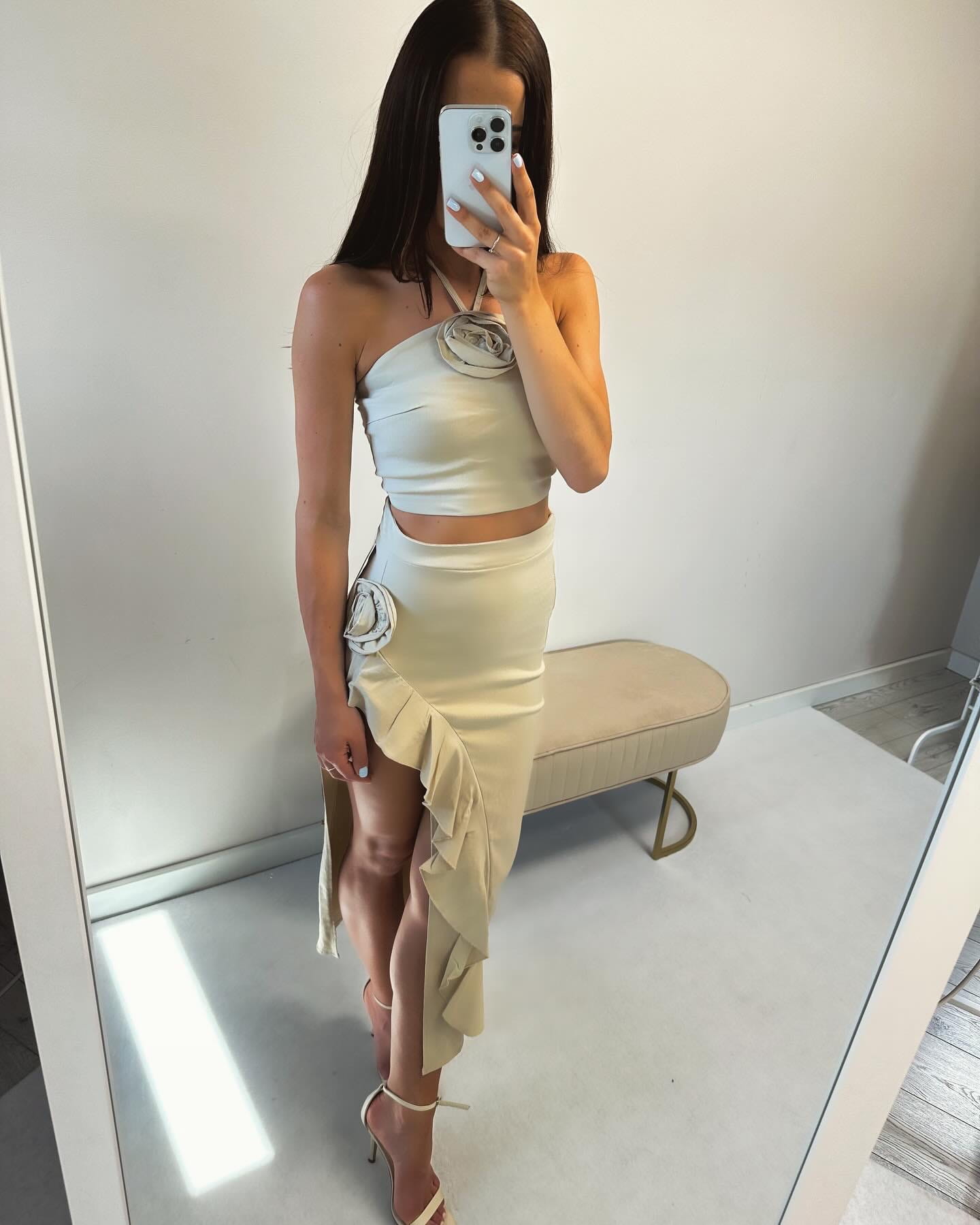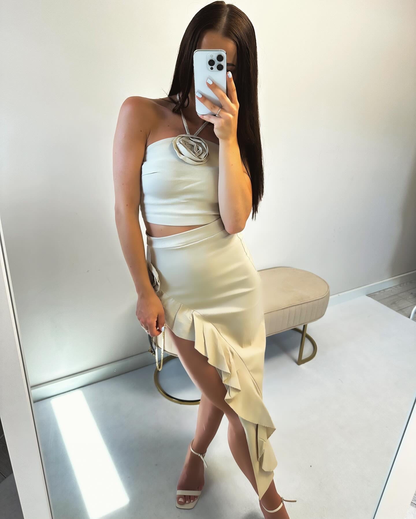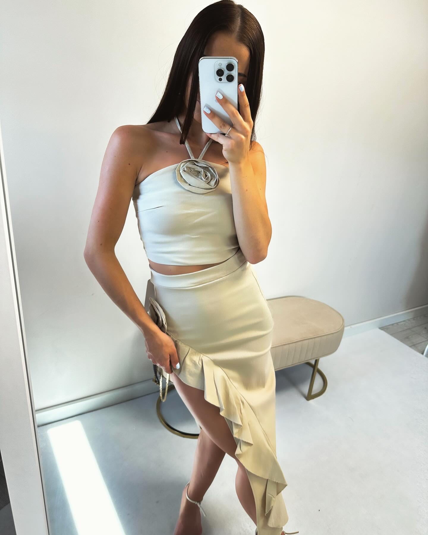 Komplet SAND - składa się z topu zdobionego różą oraz spódnicy z falbaną. To idealny zestaw na wyjazd na wakacje, plaże czy kolacje. Zestaw robi efekt WOW! Ponieważ jest wykonany z bawełny zapewnia uczucie komfortu podczas wysokich temperatur.