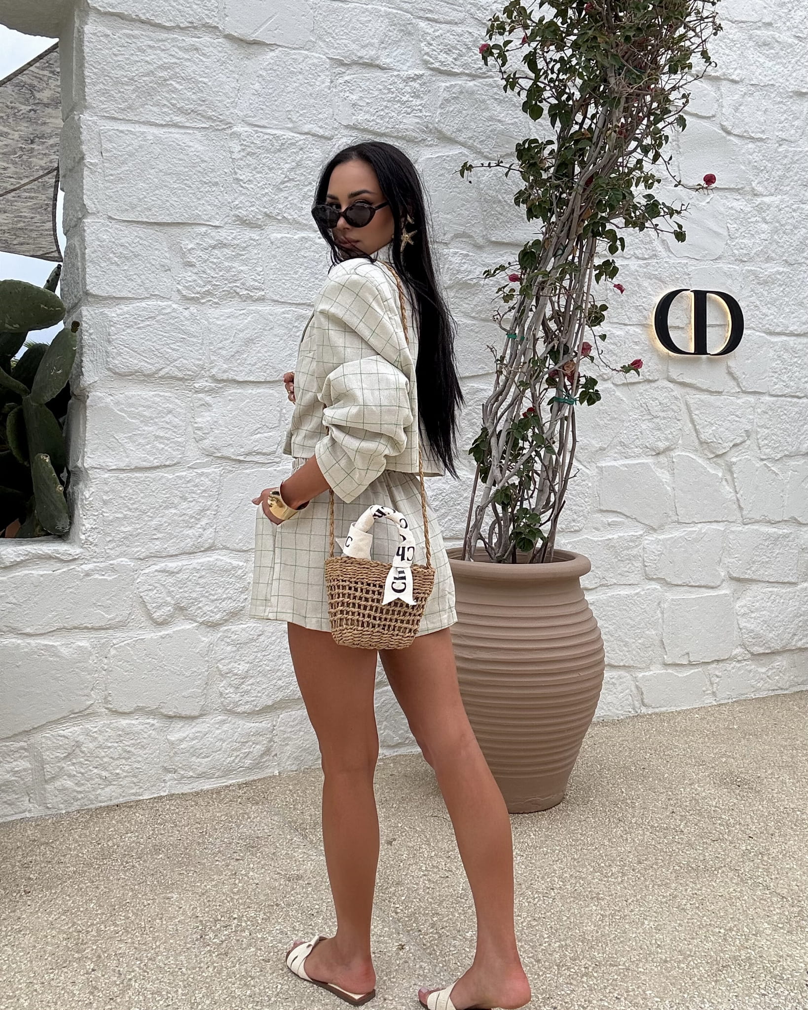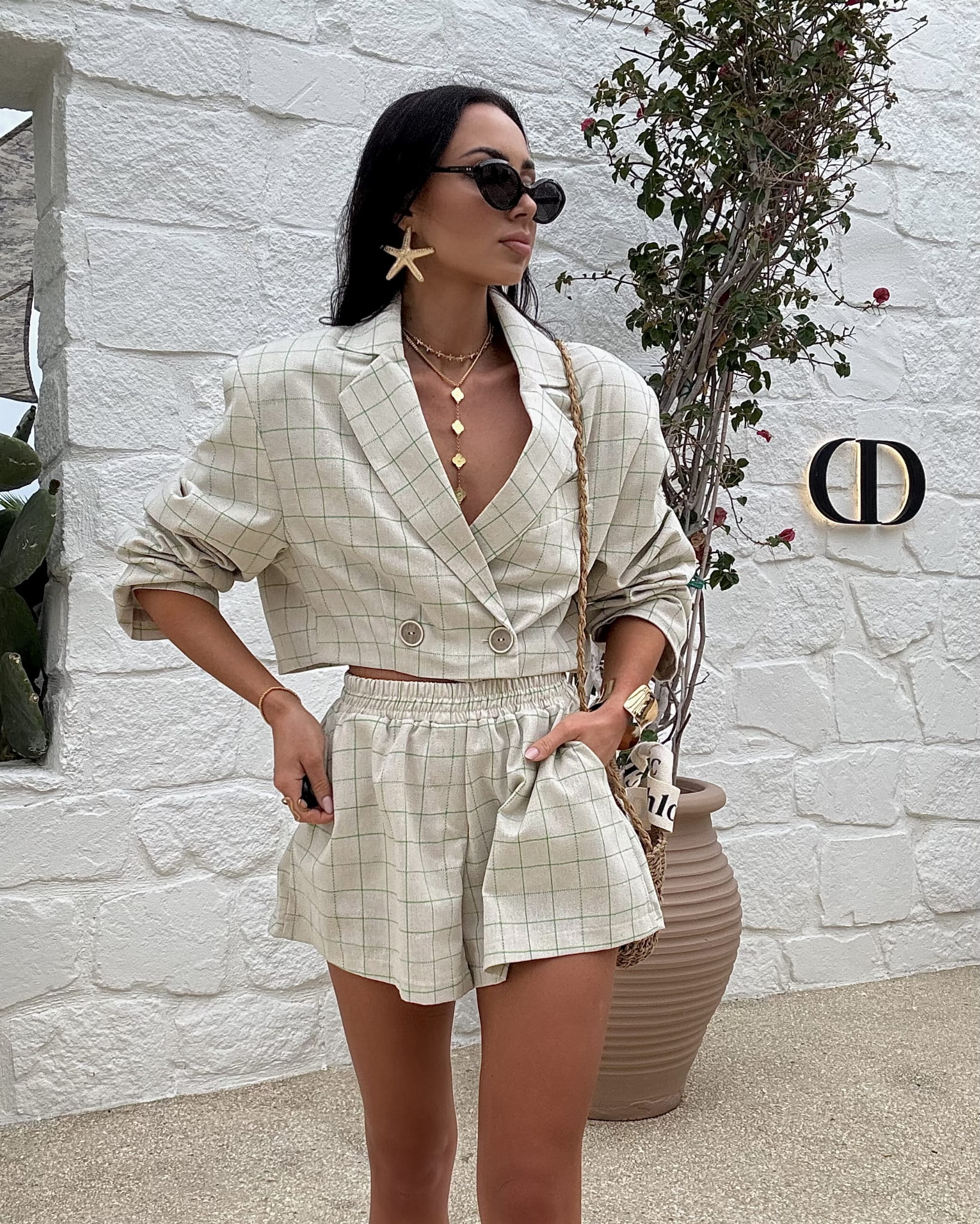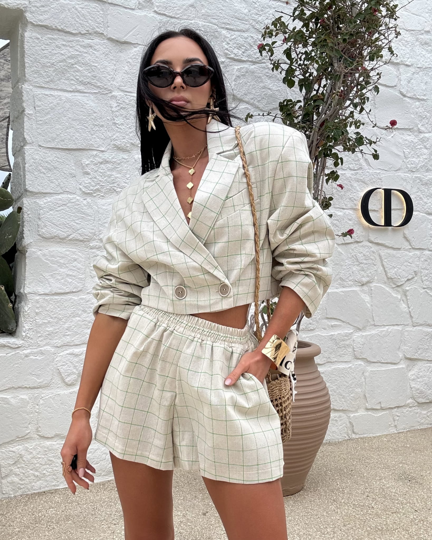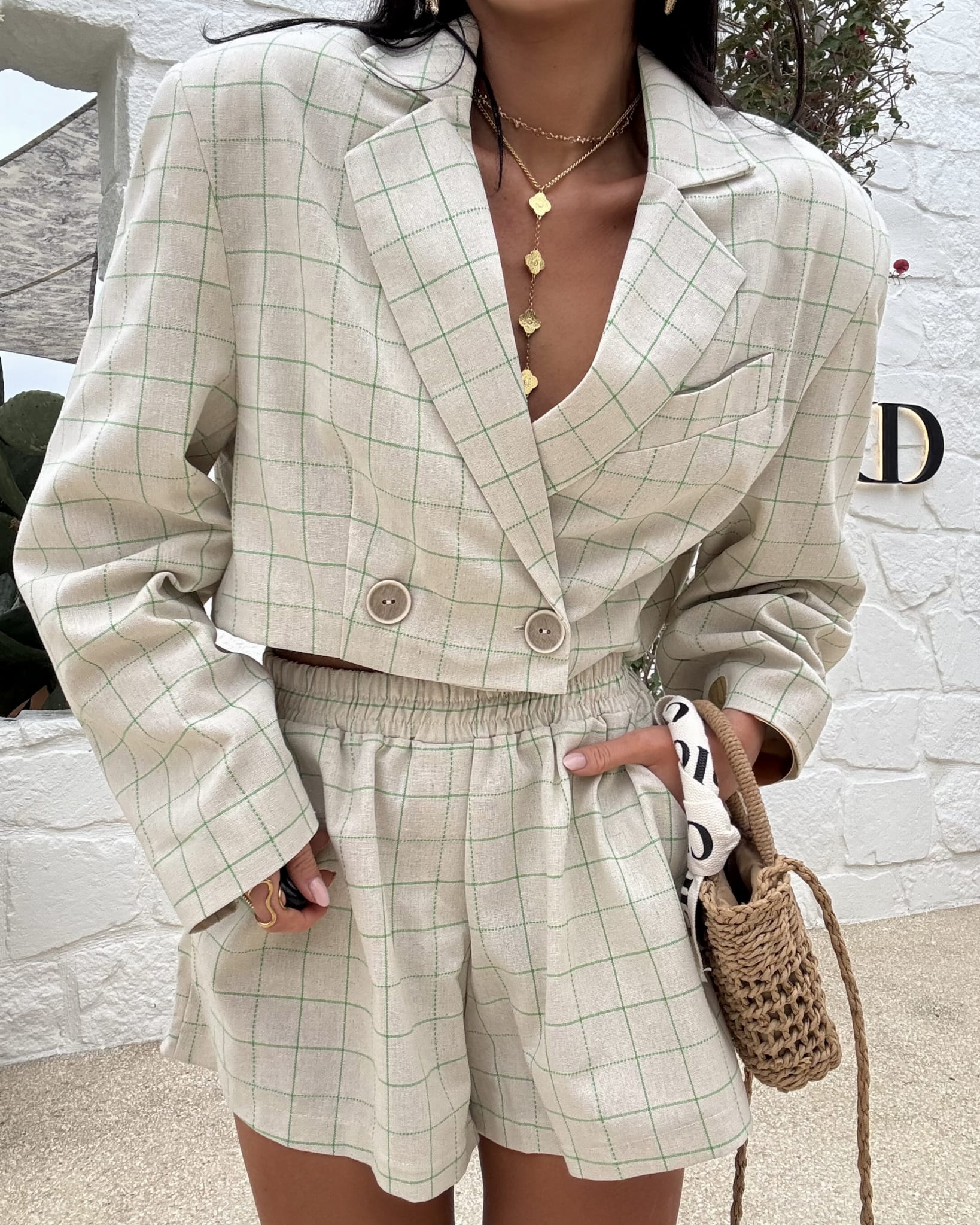 Komplet polskiej firmy modowej LaMilla składający się z marynarki i spodenek. Marynarka zapinana na drobne guziczki, obowiązkowo wszyte poduszki w ramionach. Spodenki posiadają wszytą szeroką gumę w pasie. Materiał bardzo przewiewny, ozdobiony delikatną, kolorową kratkę.