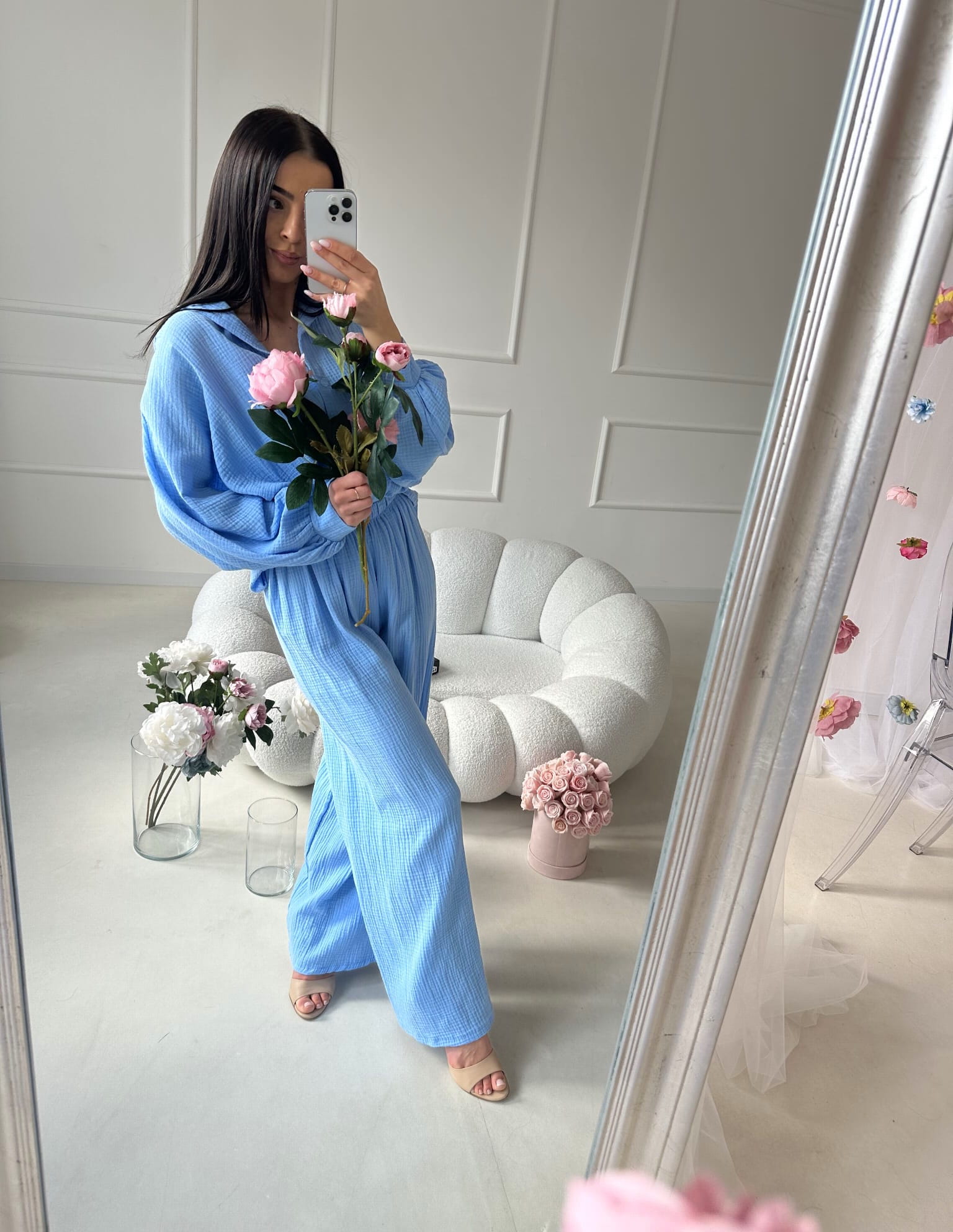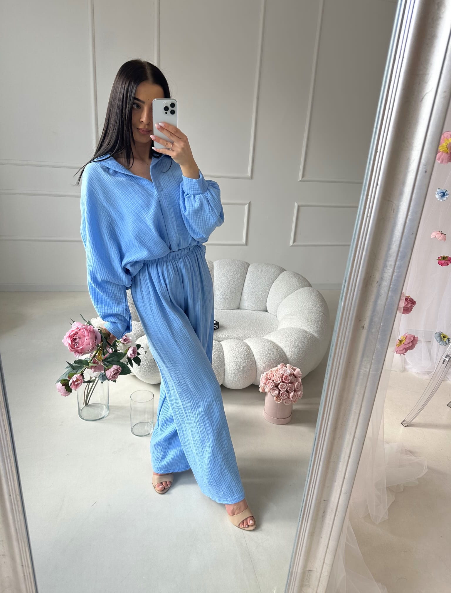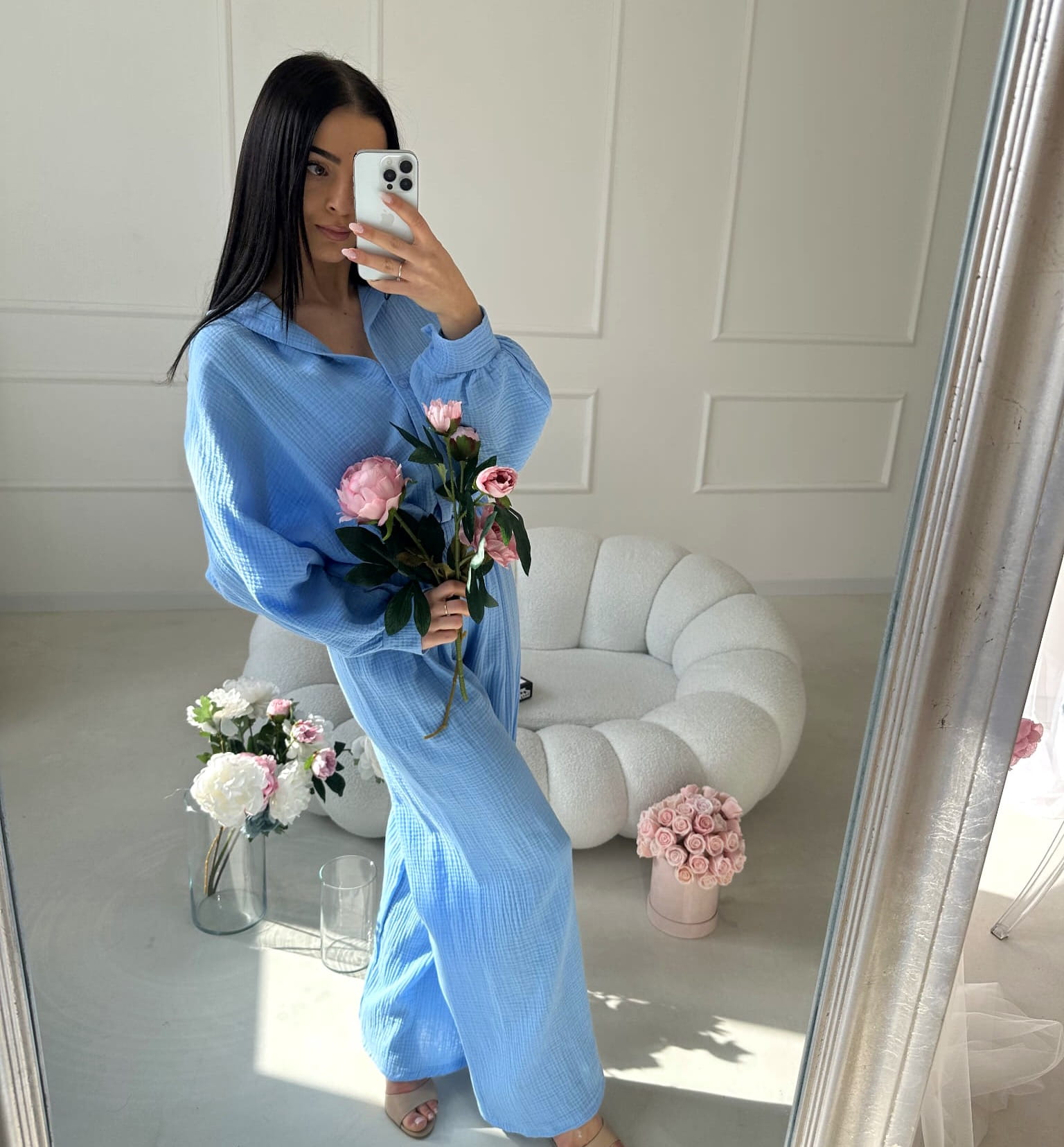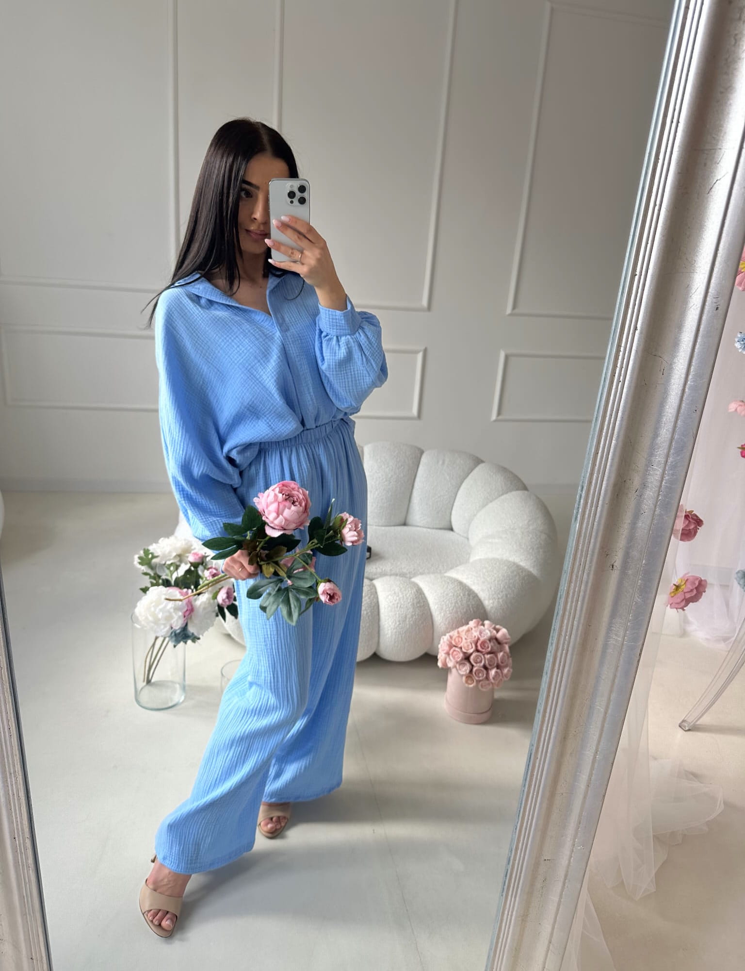 Niebieski komplet muślinowy wykonany z wysokiej jakości bawełny to idealna propozycja na wiosenne dni. Lekki, przewiewny materiał zapewnia komfort noszenia, a naturalna tkanina pozwala skórze oddychać nawet w cieplejsze dni.