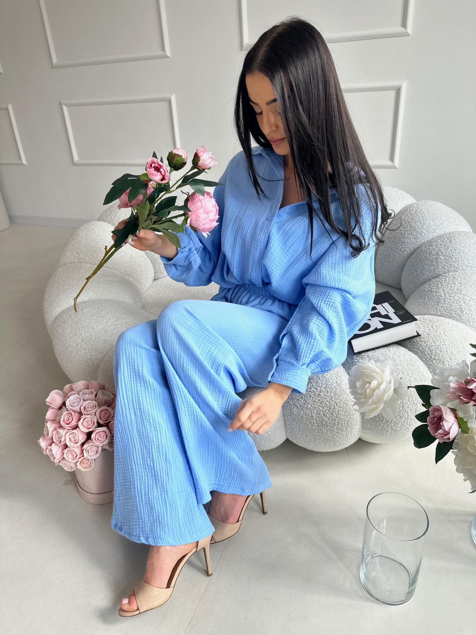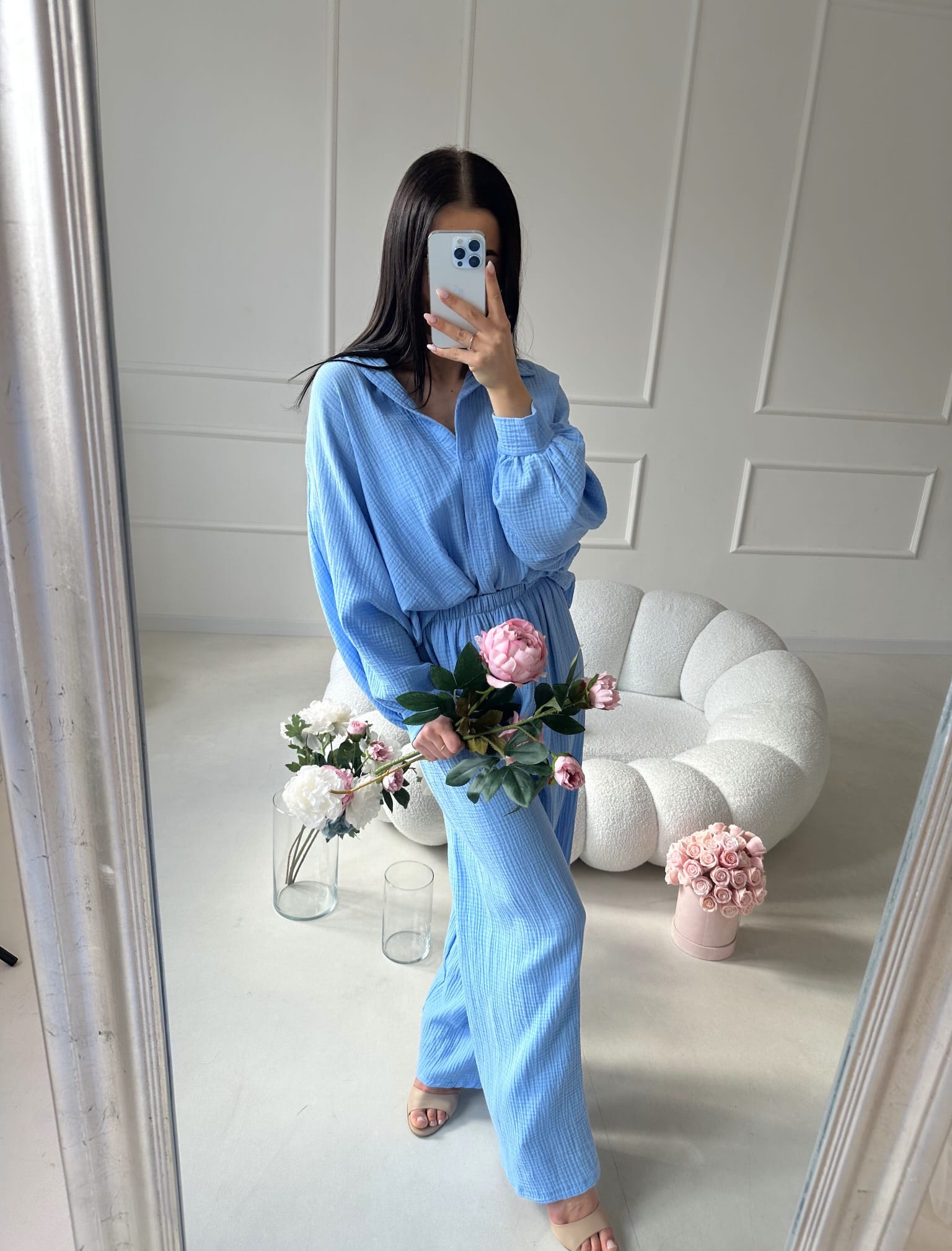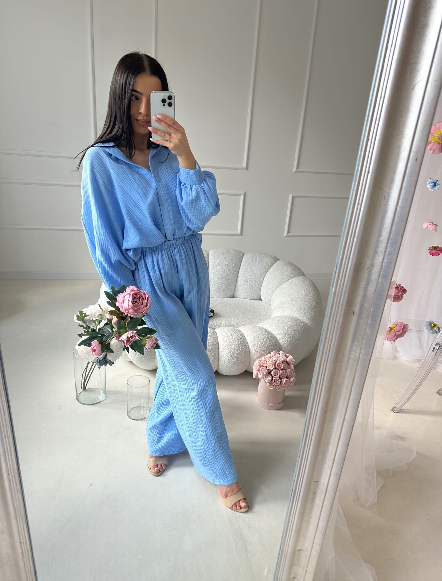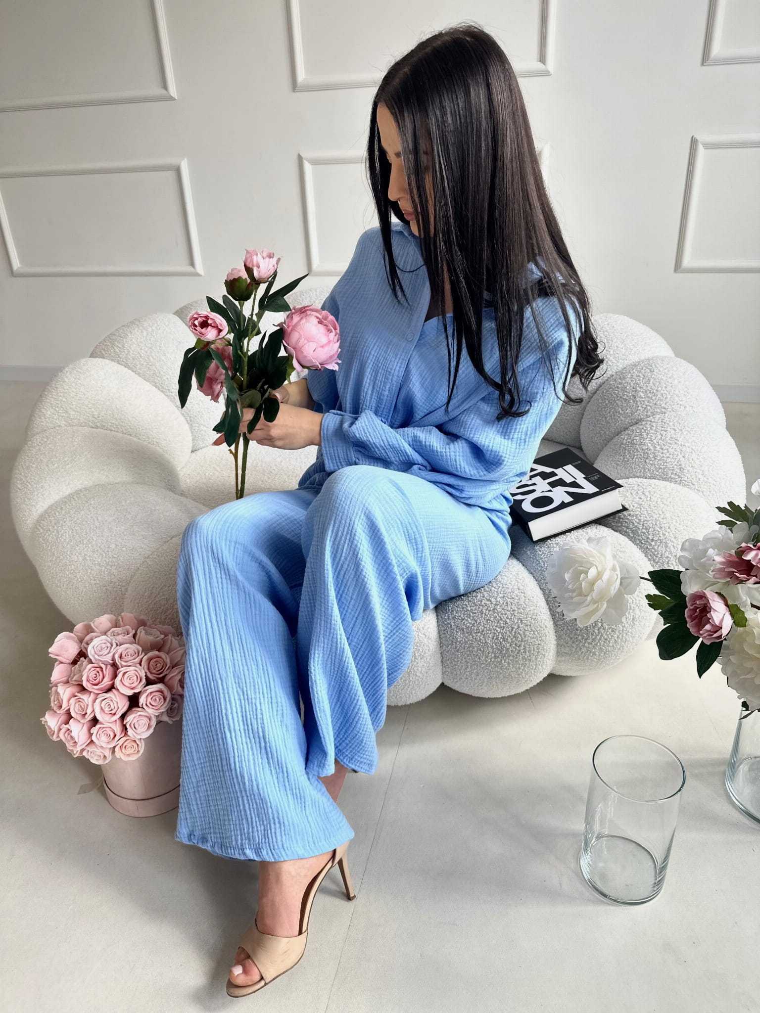 Niebieski komplet muślinowy wykonany z wysokiej jakości bawełny to idealna propozycja na wiosenne dni. Lekki, przewiewny materiał zapewnia komfort noszenia, a naturalna tkanina pozwala skórze oddychać nawet w cieplejsze dni.