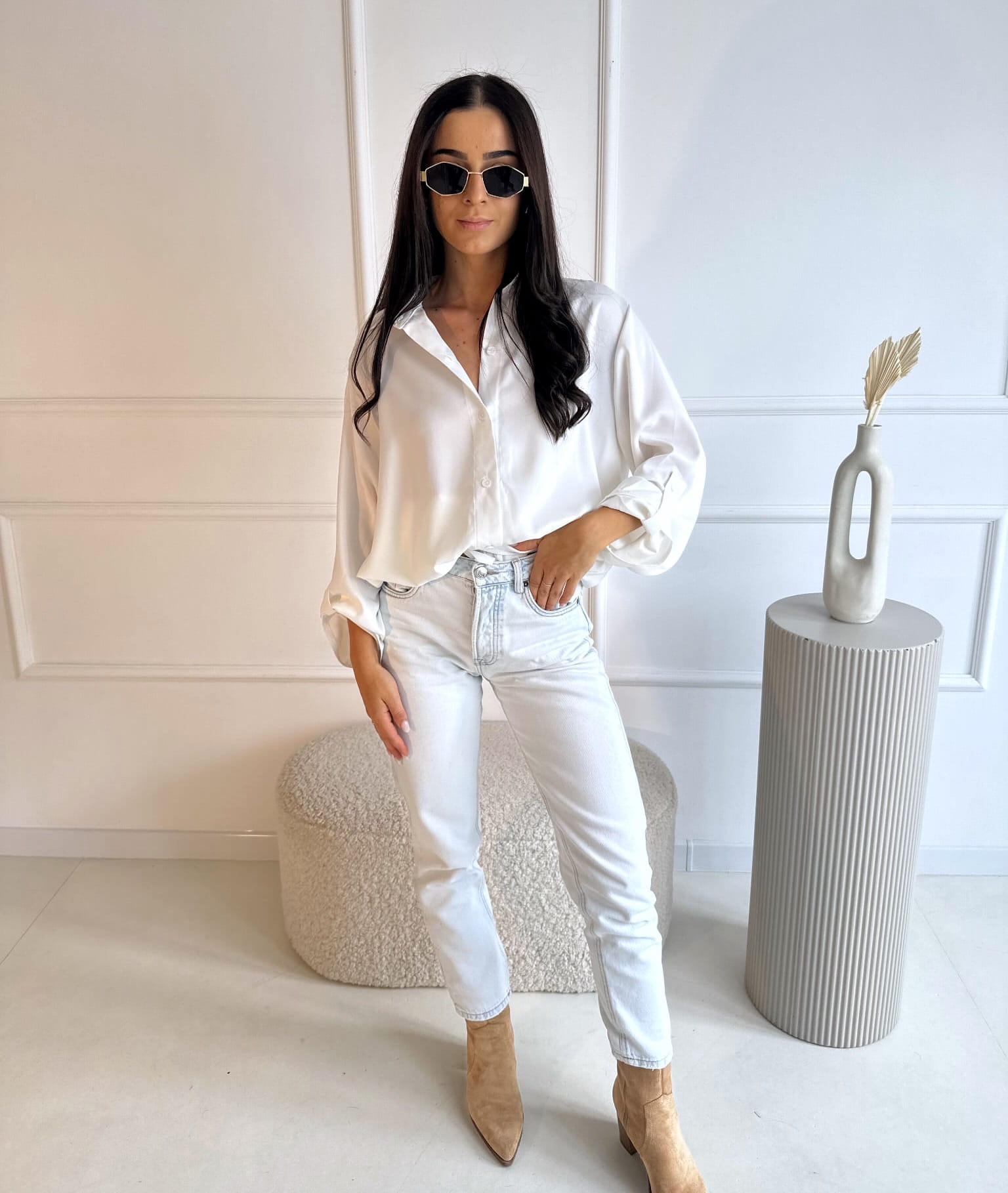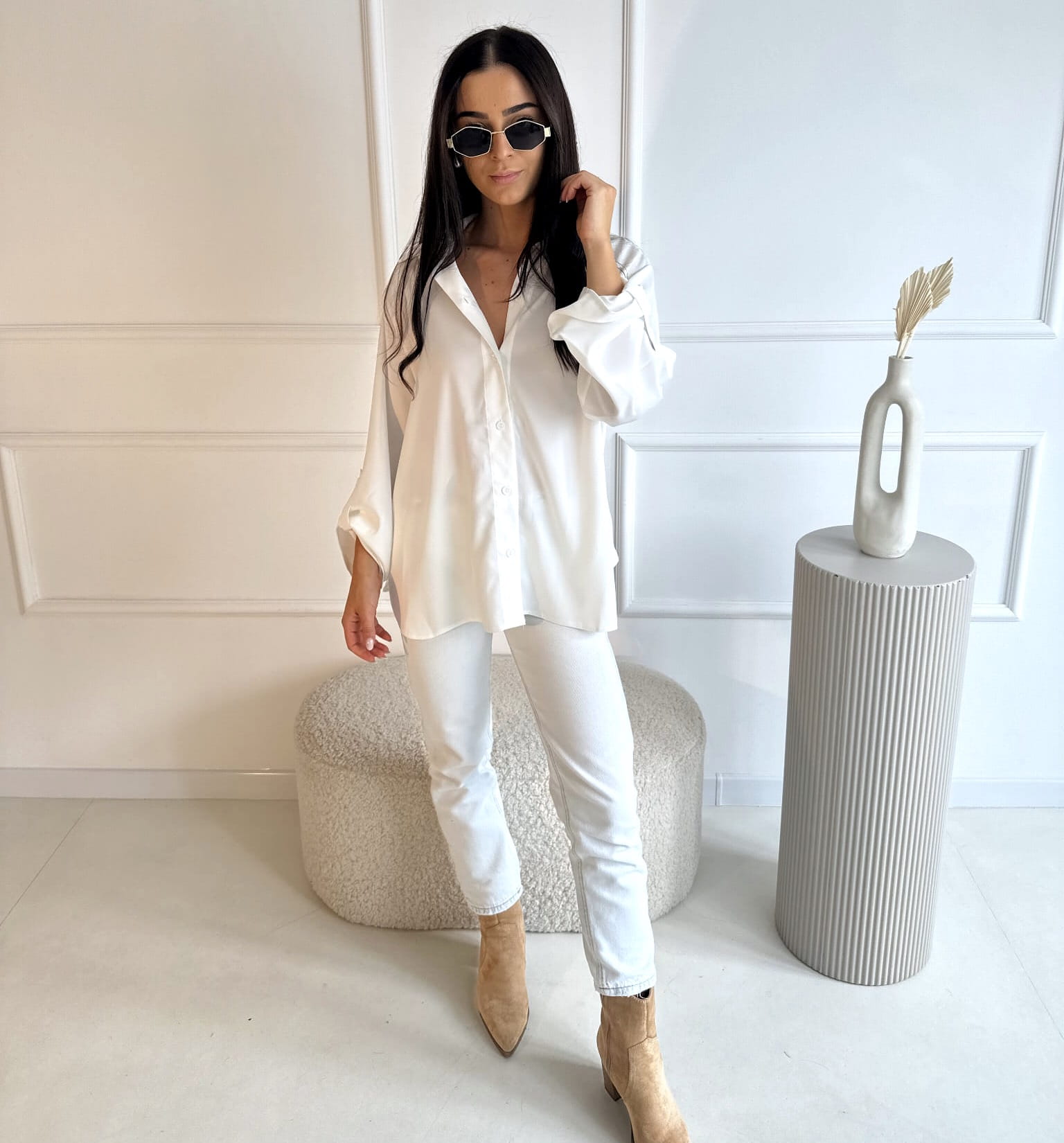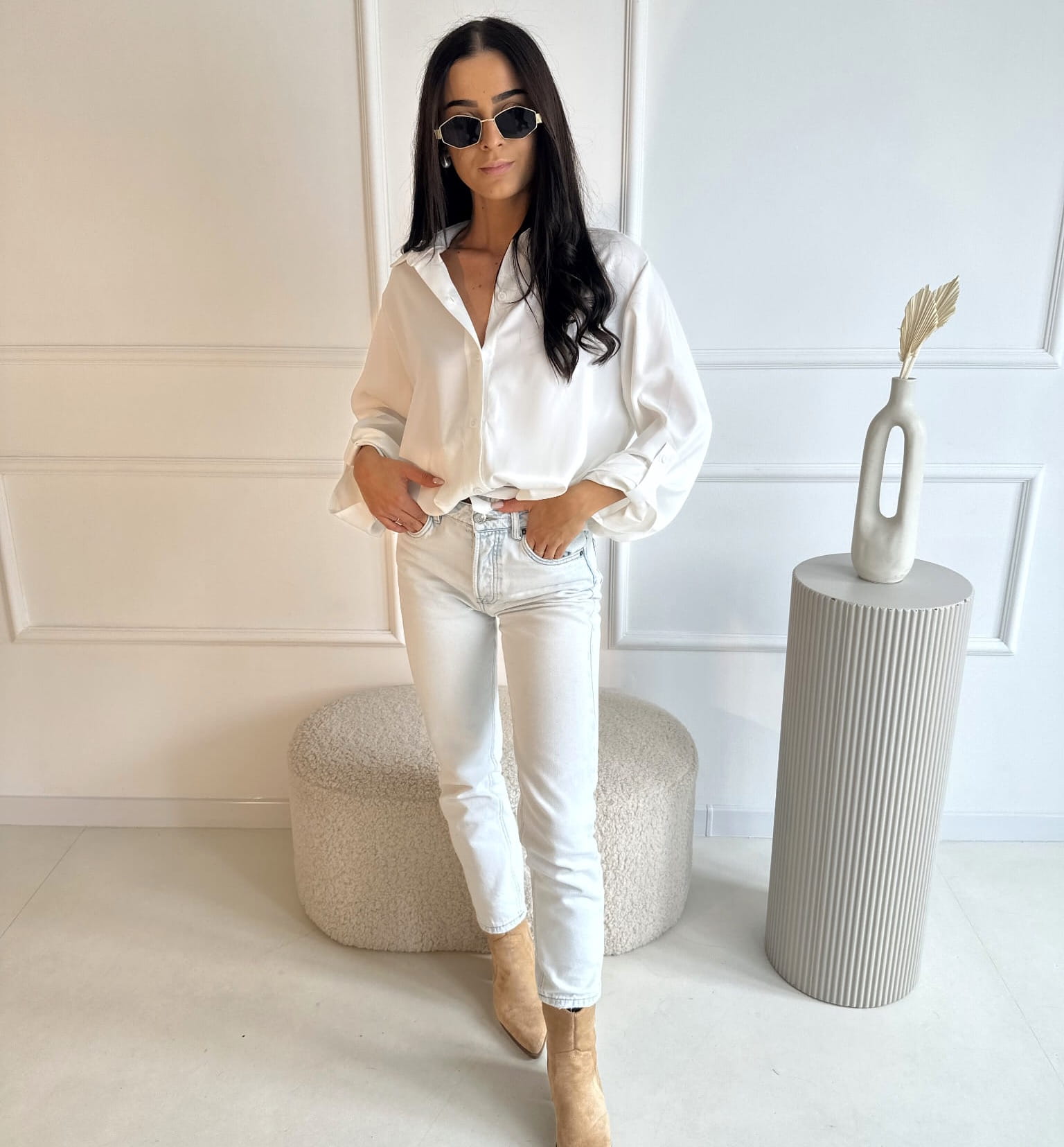 Odkryj naszą wyjątkową białą koszulę, która łączy w sobie klasę i wygodę. Uszyta z wysokiej jakości, grubszej satyny, idealnie dopasowuje się do sylwetki w rozmiarach od XS do XL. Rękawy koszuli zostały zaprojektowane z myślą o wszechstronności - możesz je zapiąć w połowie łokcia dla bardziej swobodnego wyglądu lub nosić je opuszczone, zapinane na guziki.