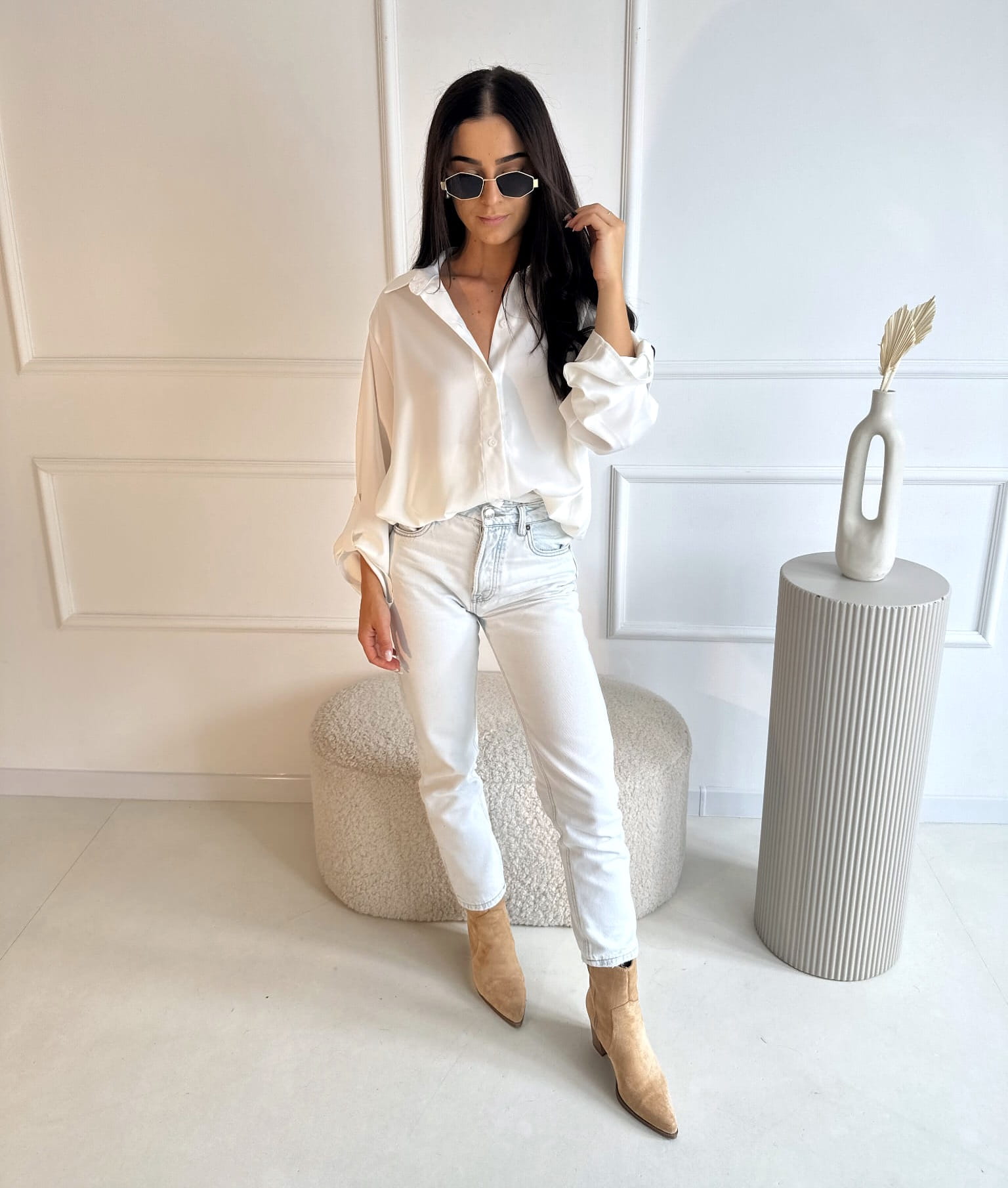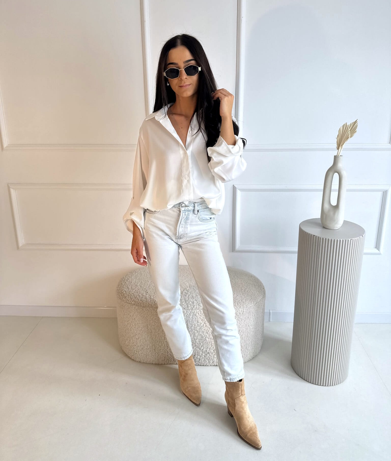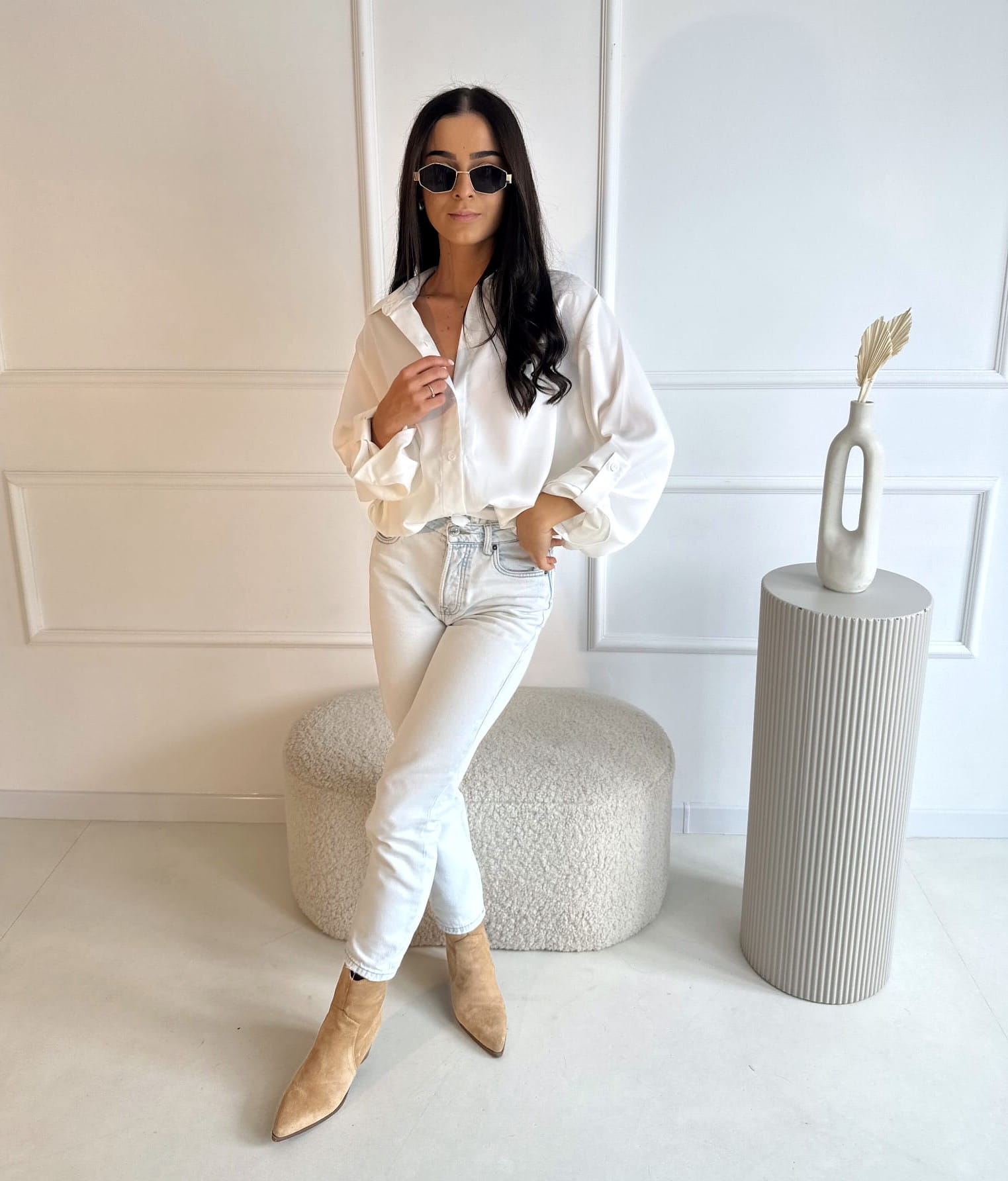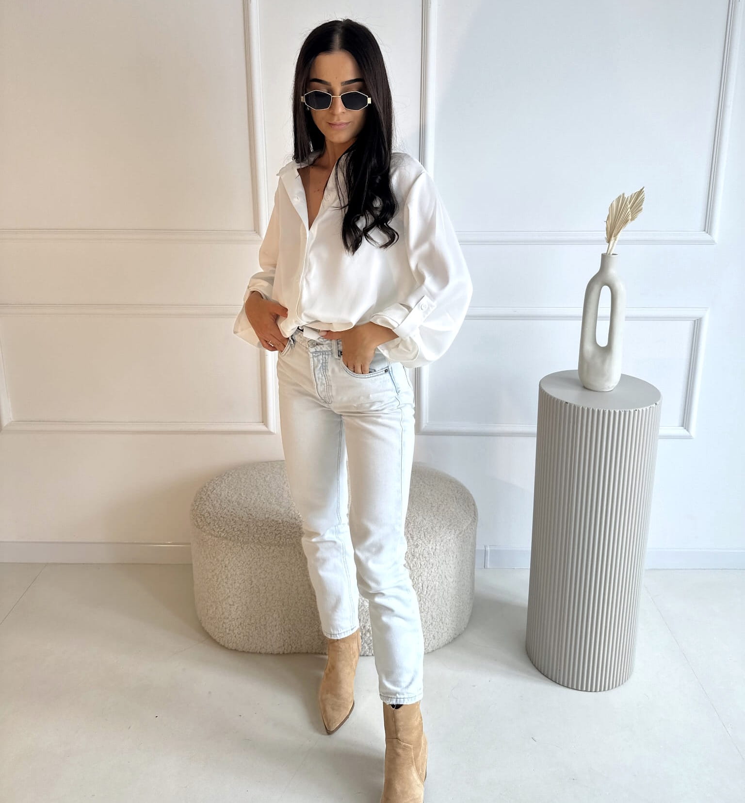 Odkryj naszą wyjątkową białą koszulę, która łączy w sobie klasę i wygodę. Uszyta z wysokiej jakości, grubszej satyny, idealnie dopasowuje się do sylwetki w rozmiarach od XS do XL. Rękawy koszuli zostały zaprojektowane z myślą o wszechstronności - możesz je zapiąć w połowie łokcia dla bardziej swobodnego wyglądu lub nosić je opuszczone, zapinane na guziki.