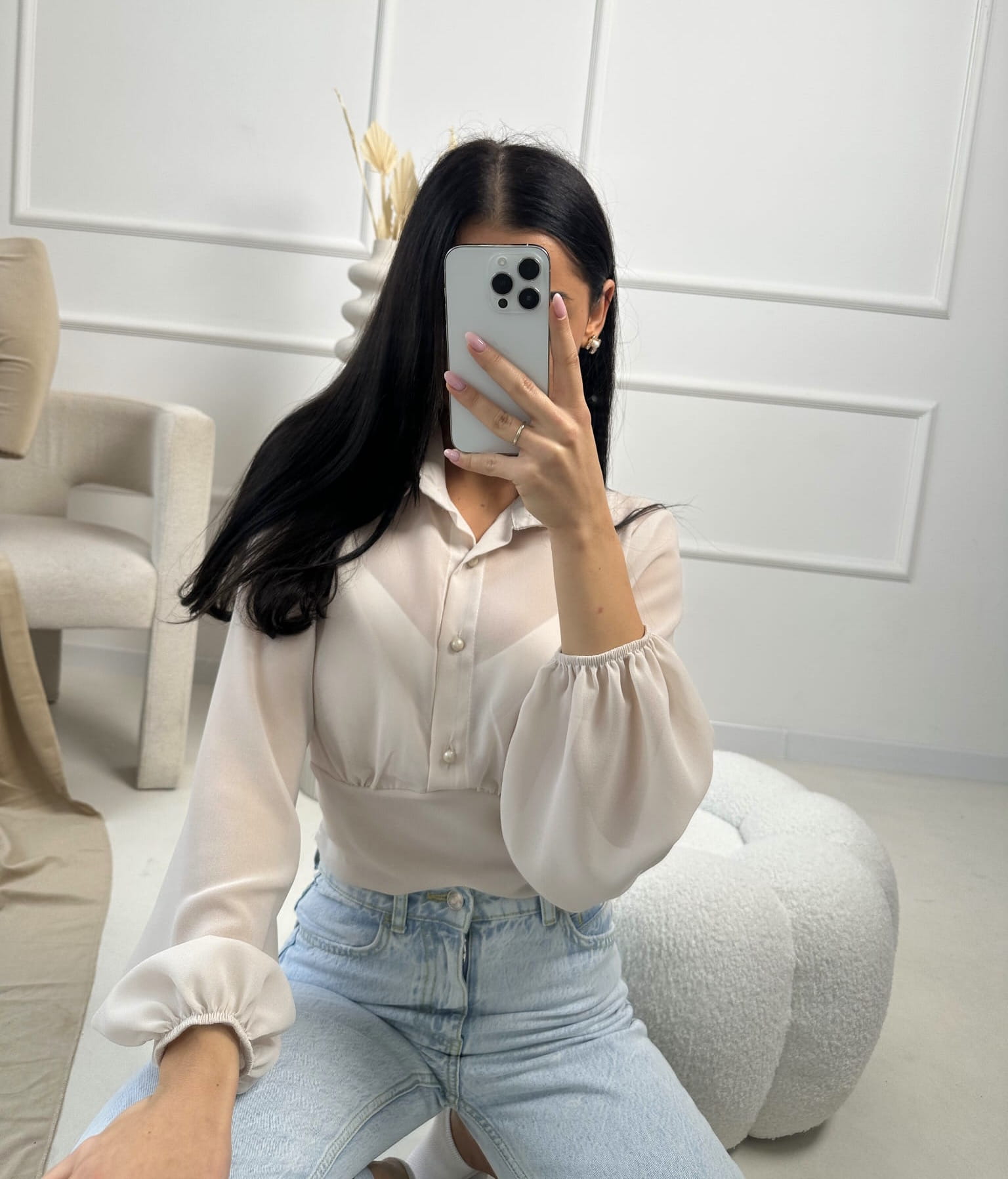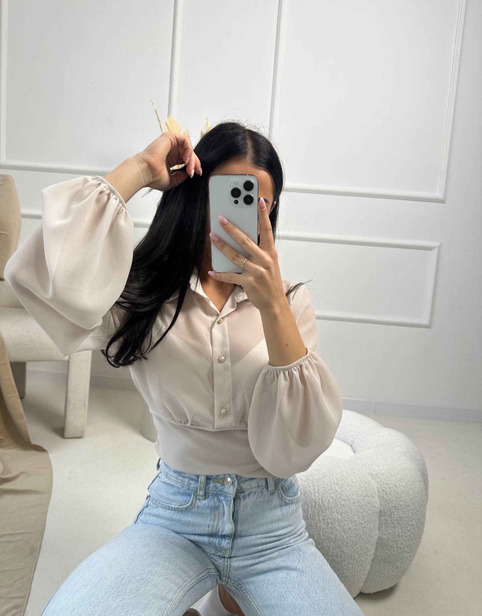 koszula z cienkiego lejącego materiału. Posiada wszyte wkładki na biust oraz ściągacz w talii. Guziki stanowią perełki… ❤️