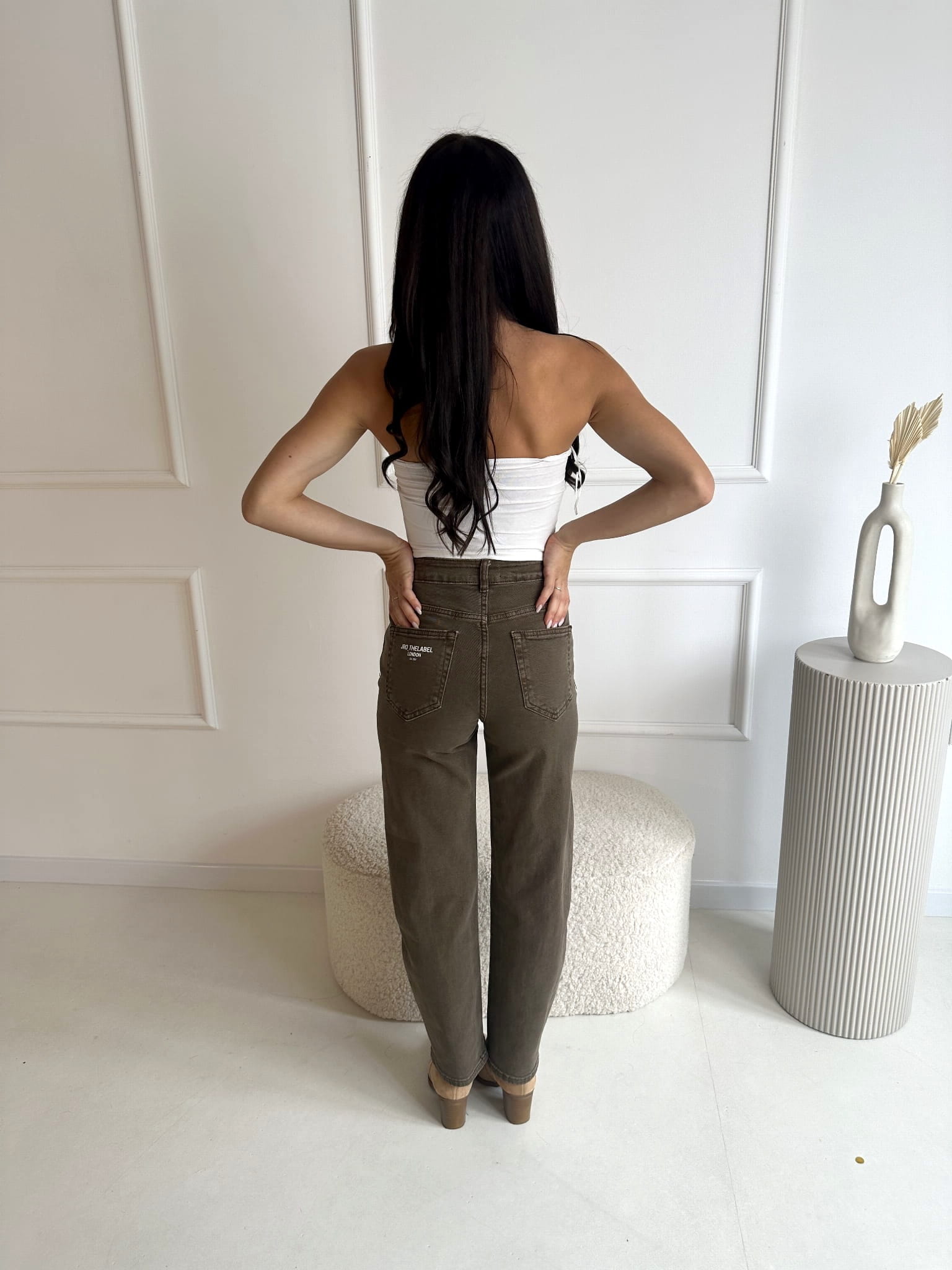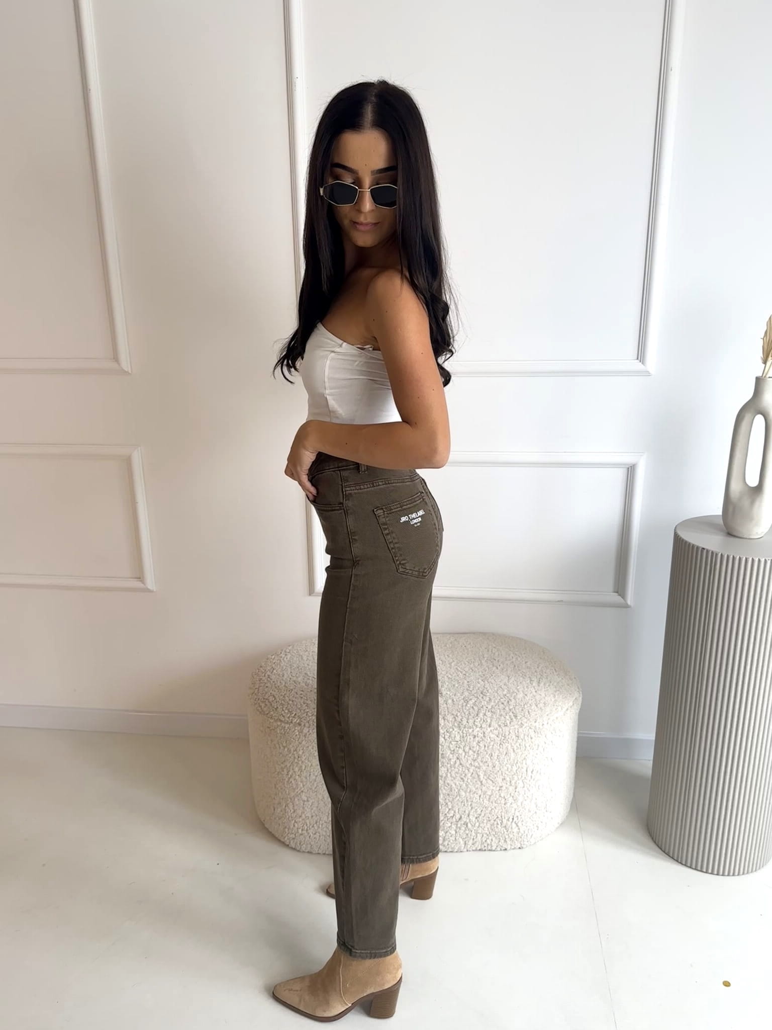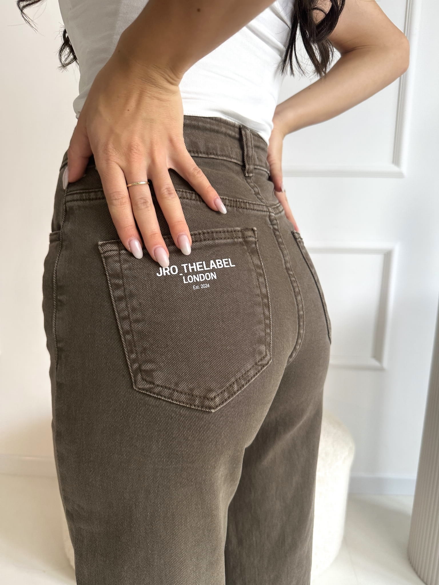 Spodnie marki J.R.O w przepięknym kolorze KHAKI - zgaszona zieleń. O kroju mom fit idealnie podkreślają sylwetkę. Świetnie nadają się dla dziewczyn o wzroście w przedziale 150-170 cm. Delikatne logo na kieszeni z tyłu.