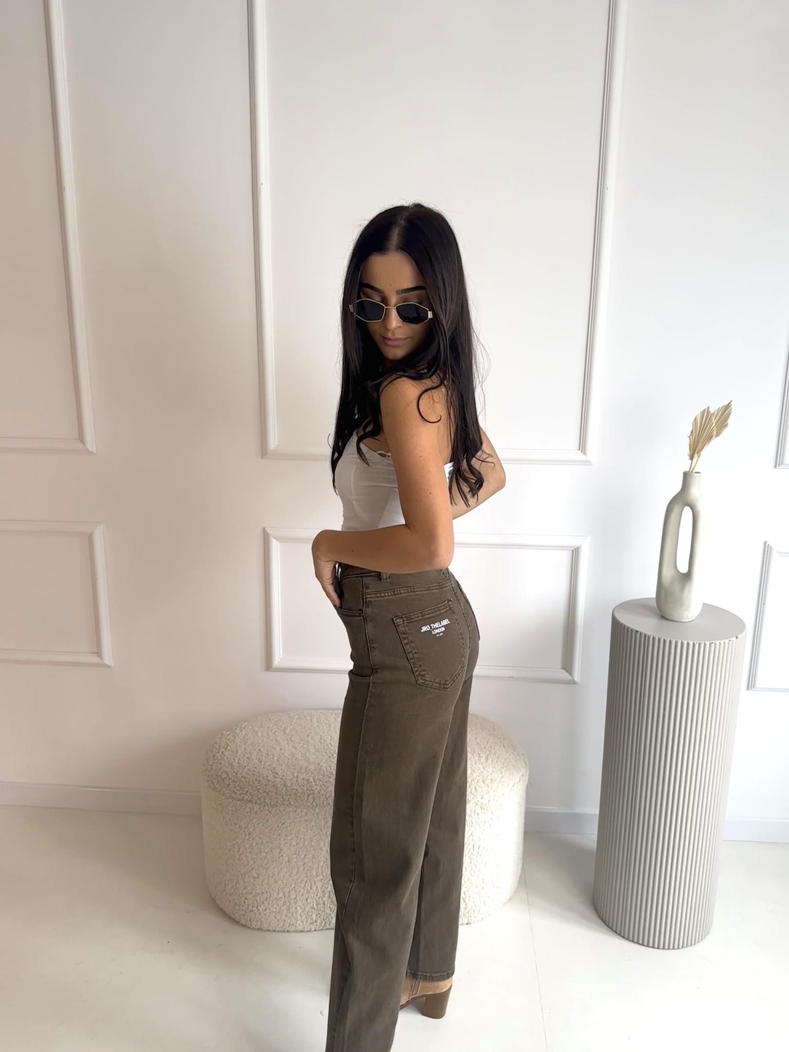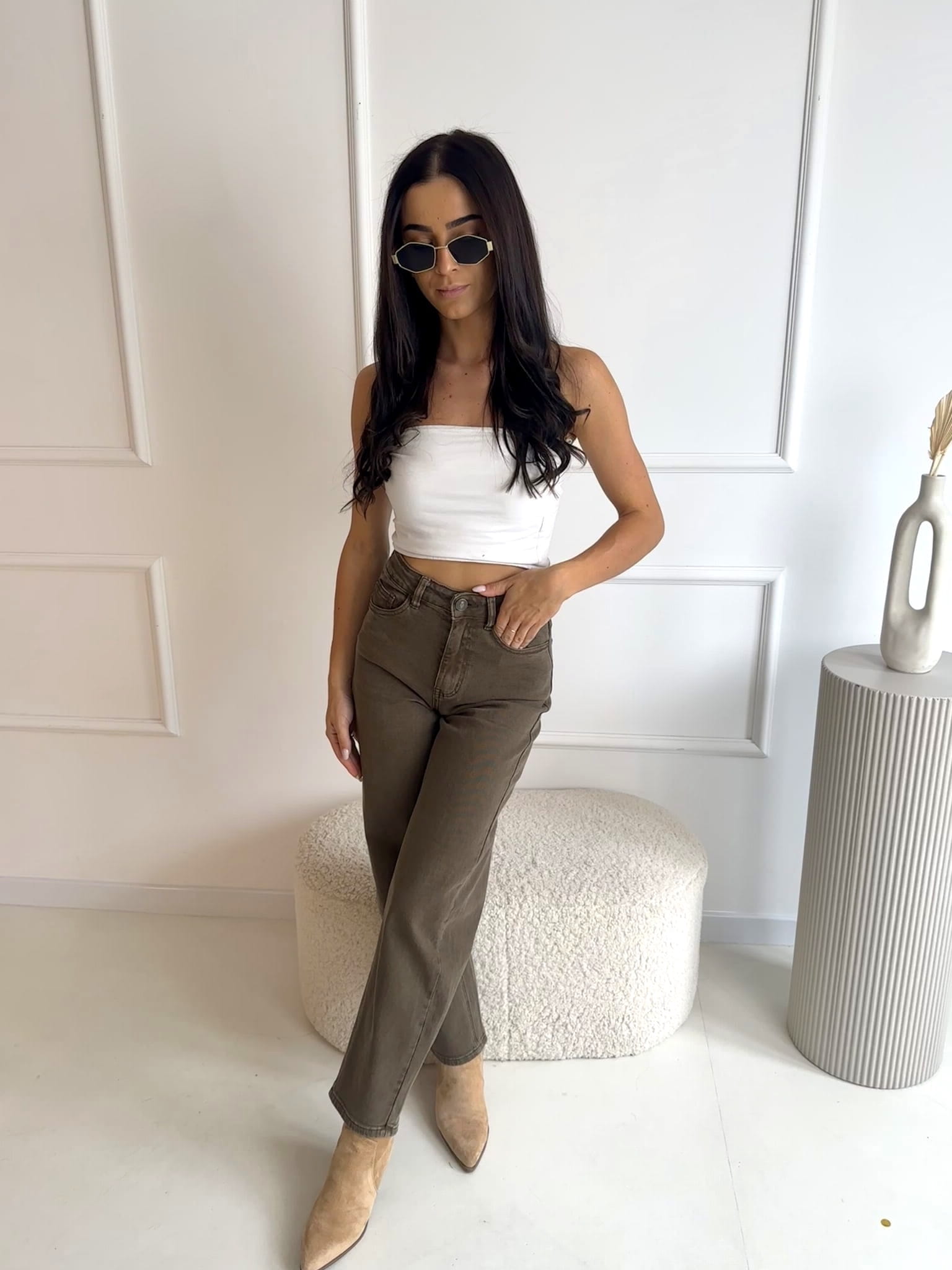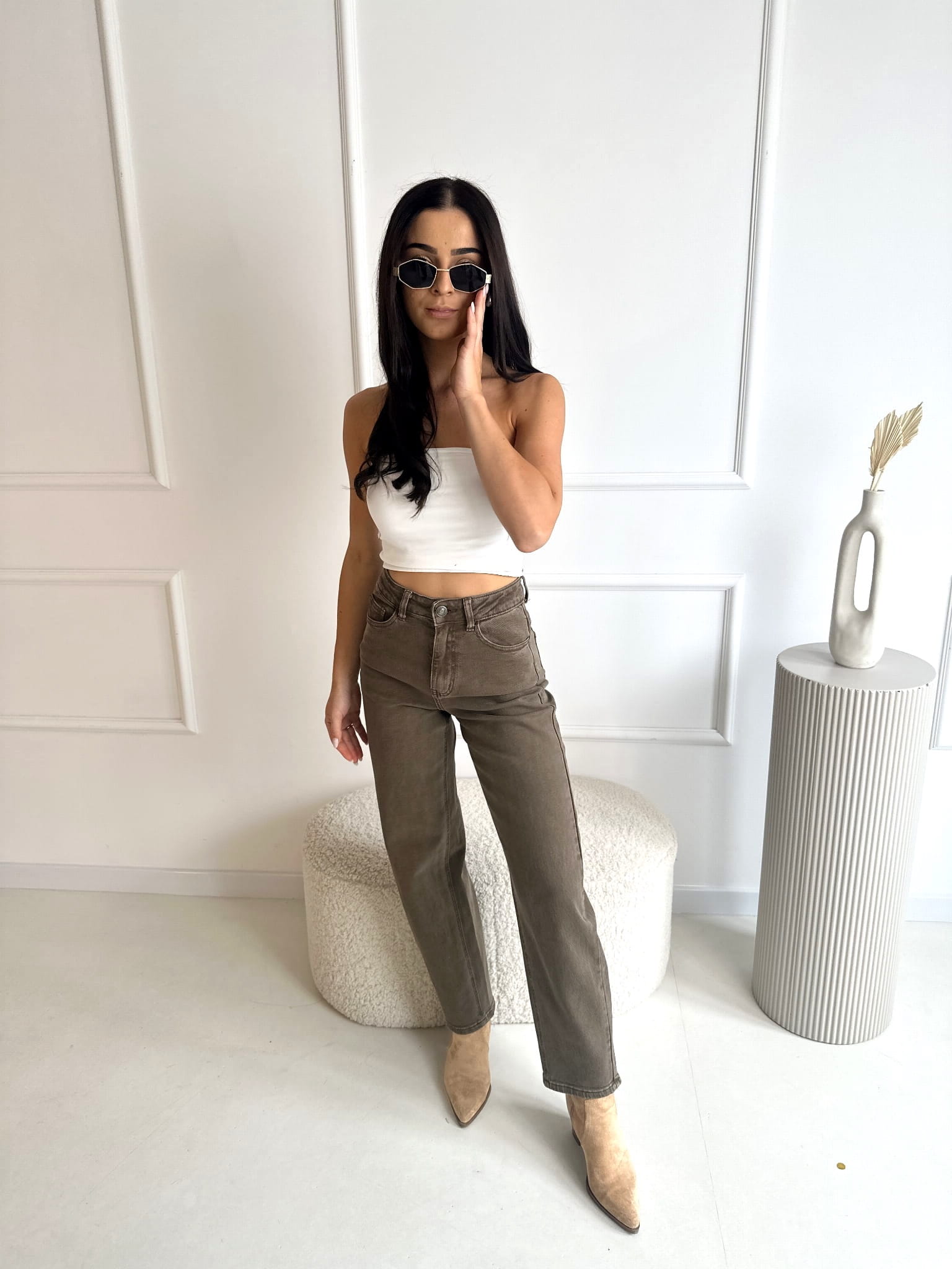Spodnie marki J.R.O w przepięknym kolorze KHAKI - zgaszona zieleń. O kroju mom fit idealnie podkreślają sylwetkę. Świetnie nadają się dla dziewczyn o wzroście w przedziale 150-170 cm. Delikatne logo na kieszeni z tyłu.