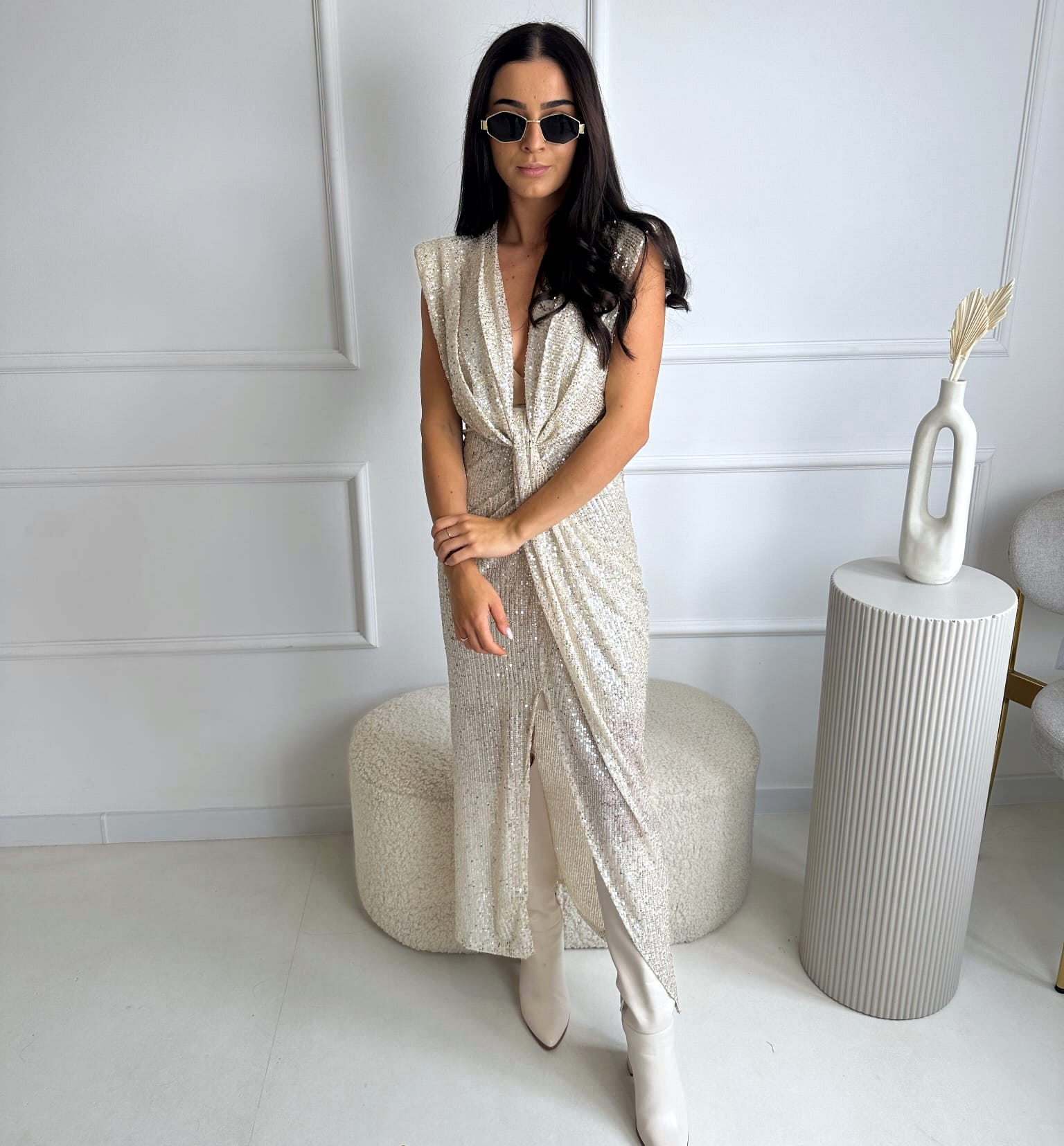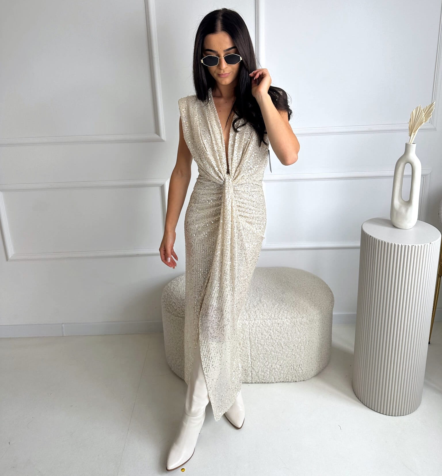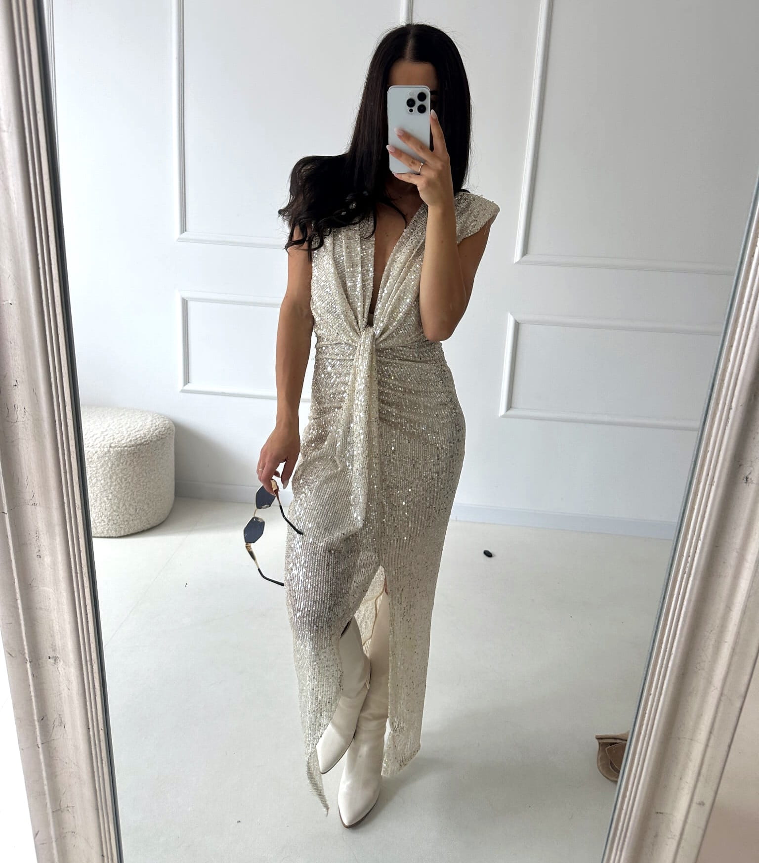 Sukienka Maxi srebrna z cekinami. Dekolt sukienki głęboki - szerokość sami możemy regulować. Sukienka posiada rozcięcie po boku o długości 56cm. Posiada podszewkę oraz pagony na ramionach. Sukienka z tyłu gładka