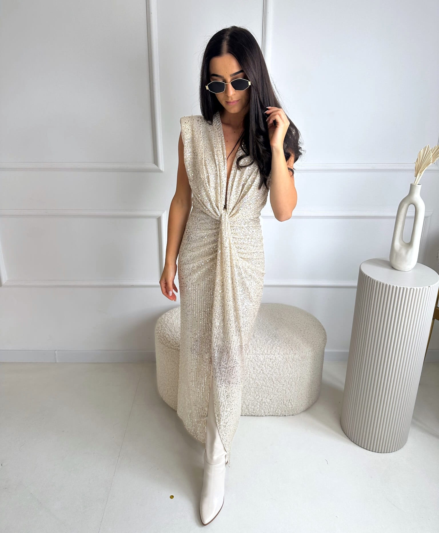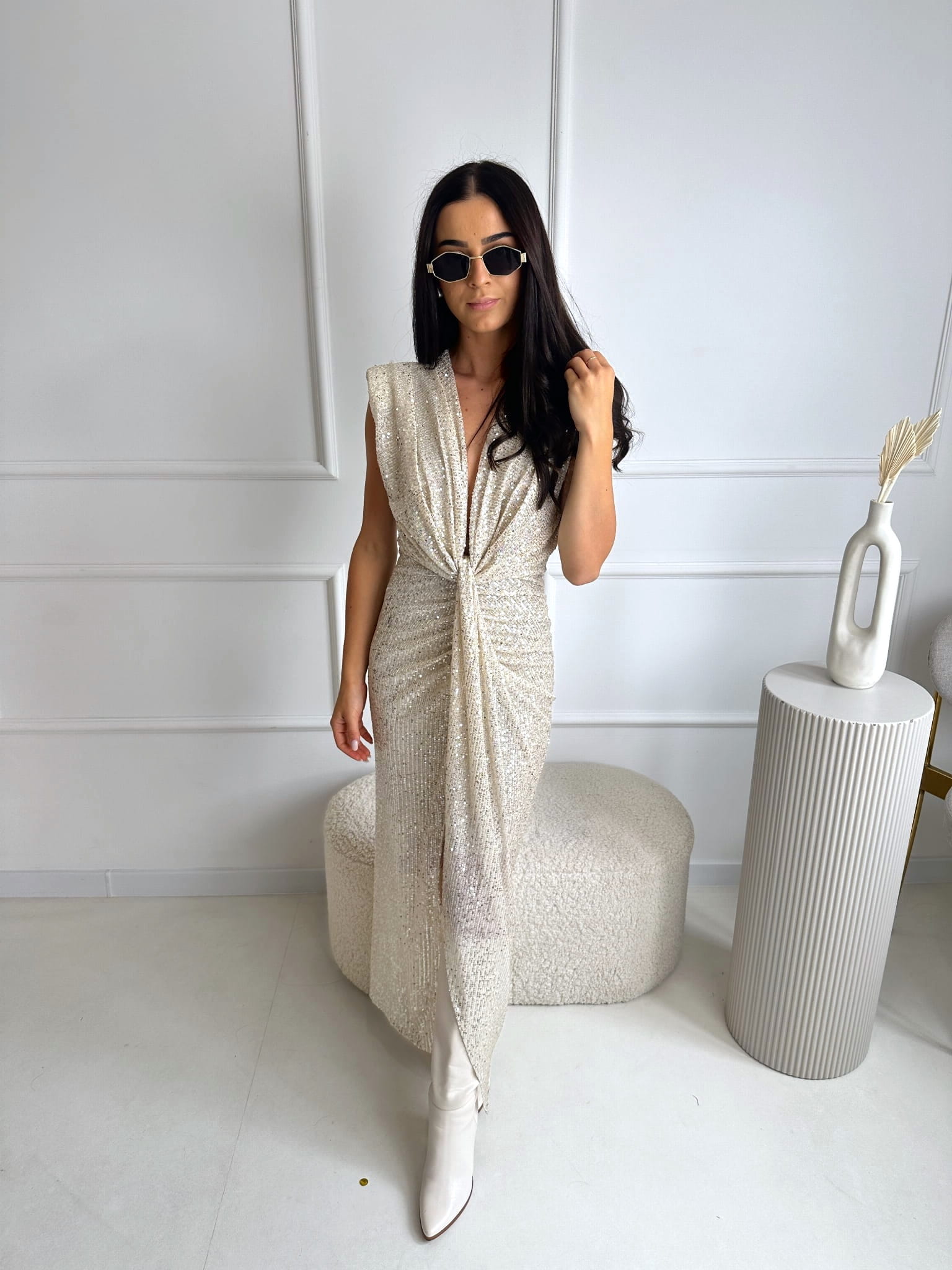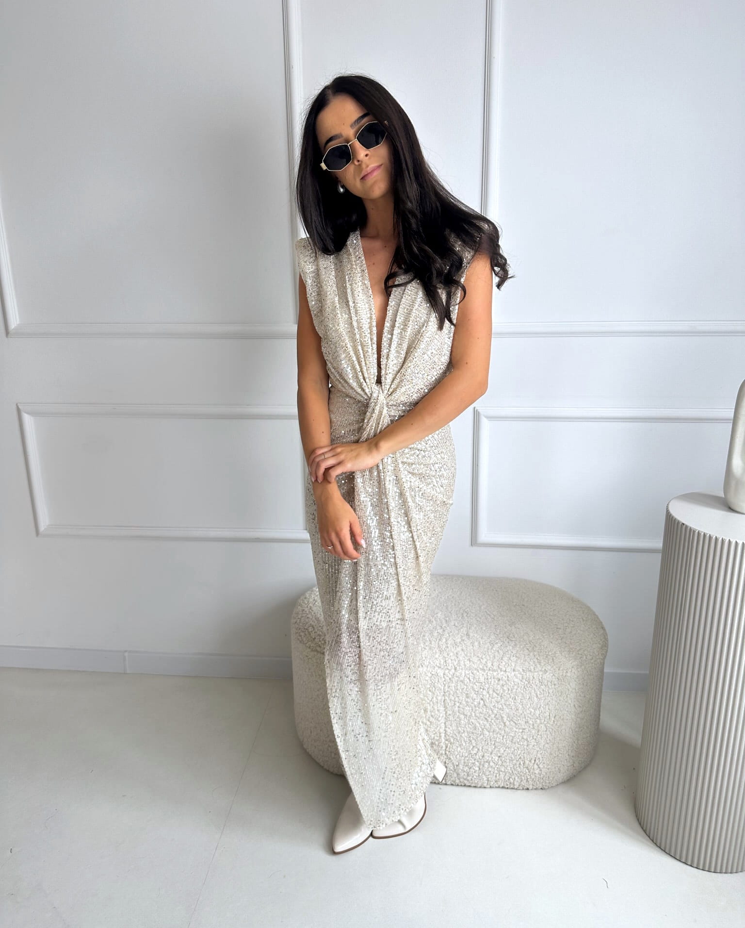 Sukienka Maxi srebrna z cekinami. Dekolt sukienki głęboki - szerokość sami możemy regulować. Sukienka posiada rozcięcie po boku o długości 56cm. Posiada podszewkę oraz pagony na ramionach. Sukienka z tyłu gładka