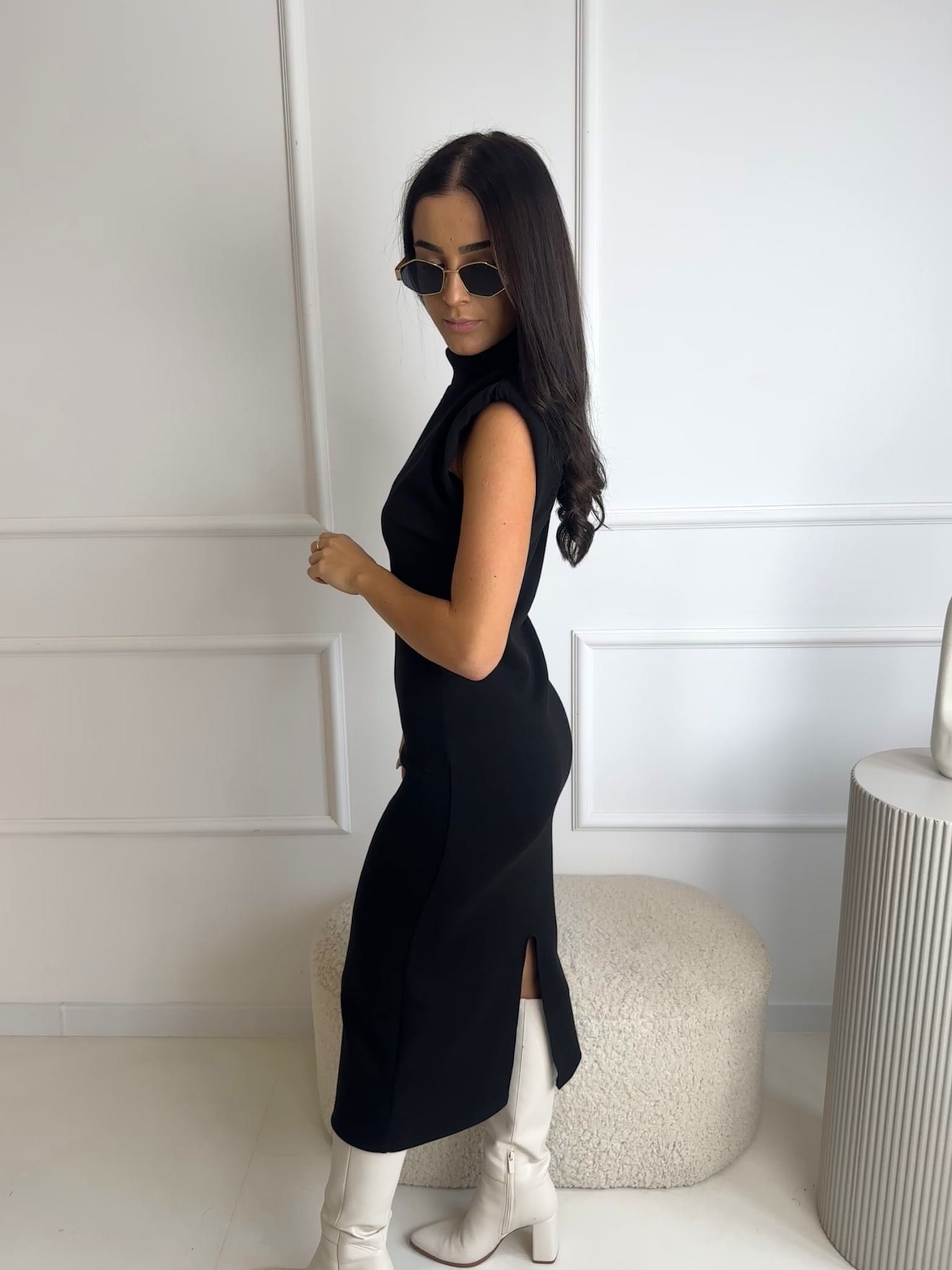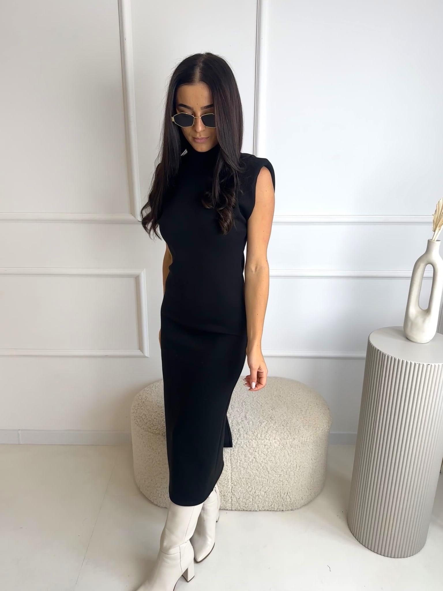 Sukienka dzianinowa midi o prostym kroju, wykonana z miękkiego i elastycznego materiału. Okrągły dekolt podkreśla klasyczny charakter, a poduszki na ramionach nadają jej eleganckiego wyglądu. Krótki rękaw sprawia, że jest idealna na różne okazje. Rozcięcie z tyłu dodaje kobiecego akcentu i zapewnia wygodę podczas noszenia. Materiał tak zwane masełko.
