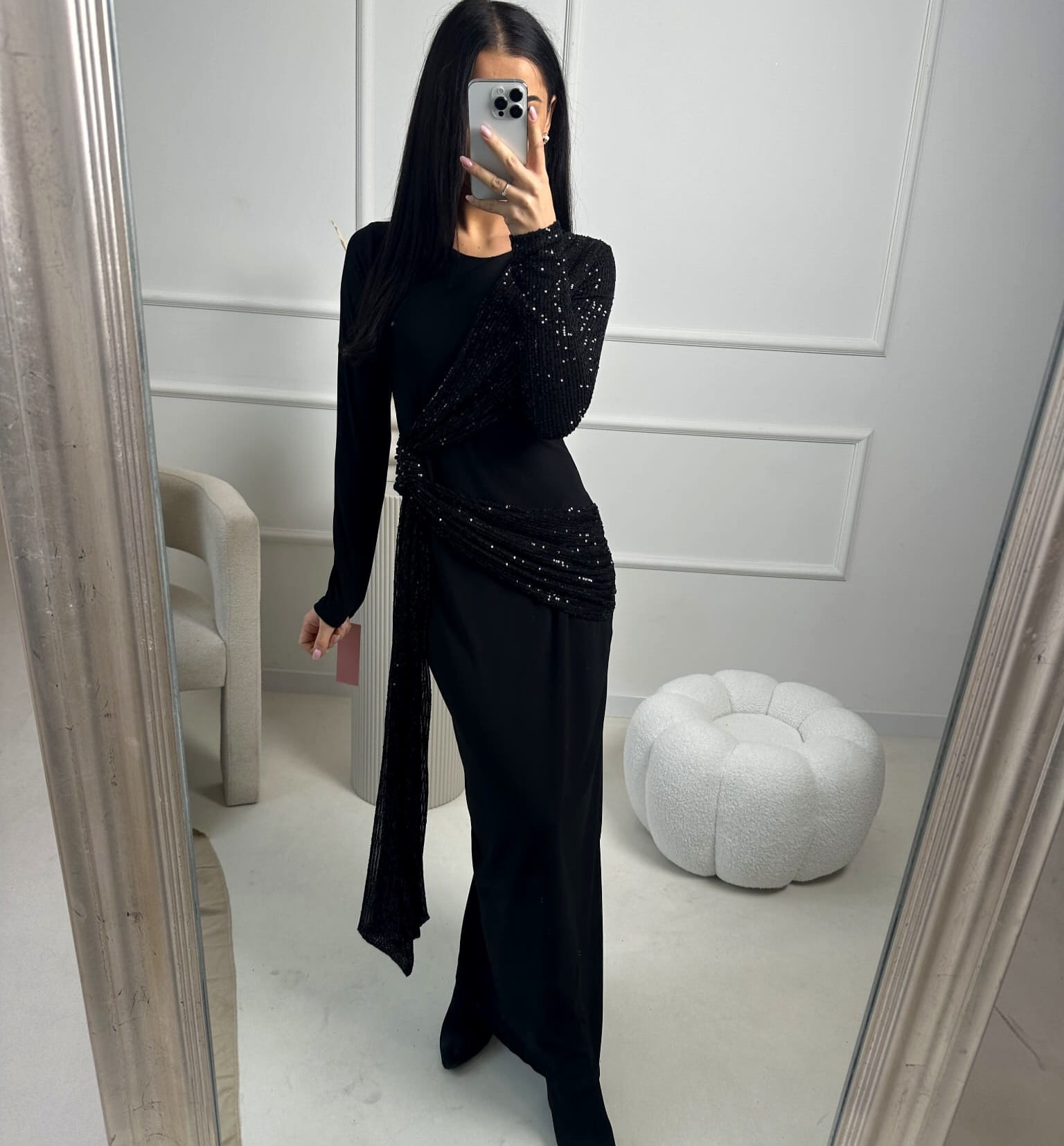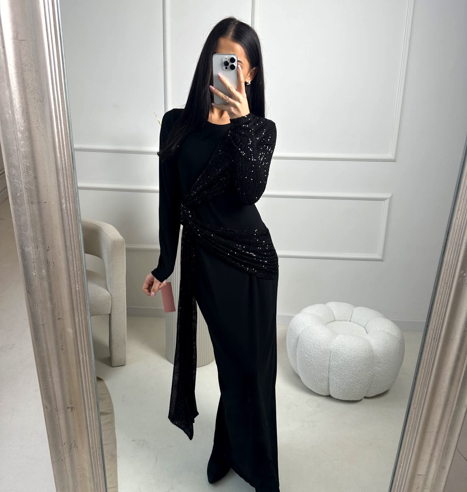 Piękna maxi z długim rękawem i dekoltem pod szyję, która podkreśli Twoją figurę. Posiada dodatkową warstwę materiału z przodu tworząca subtelne drapowanie materiału, dzięki czemu sukienka lekko układa się na biodrach i subtelnie kamufluje niedoskonałości sylwetki. Model należy prasować na lewej stronie.